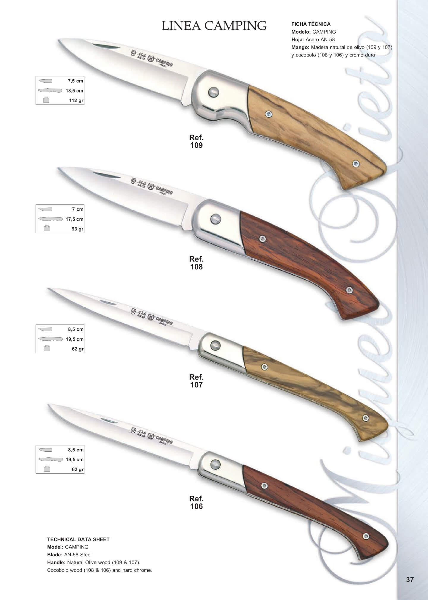Navaja con hoja de acero AN-58 de 7; 7,5 y 8,5 cm. Mango de madera natural de olivo (109 y 107) y cocobolo (108 y 106) y cromo duro.