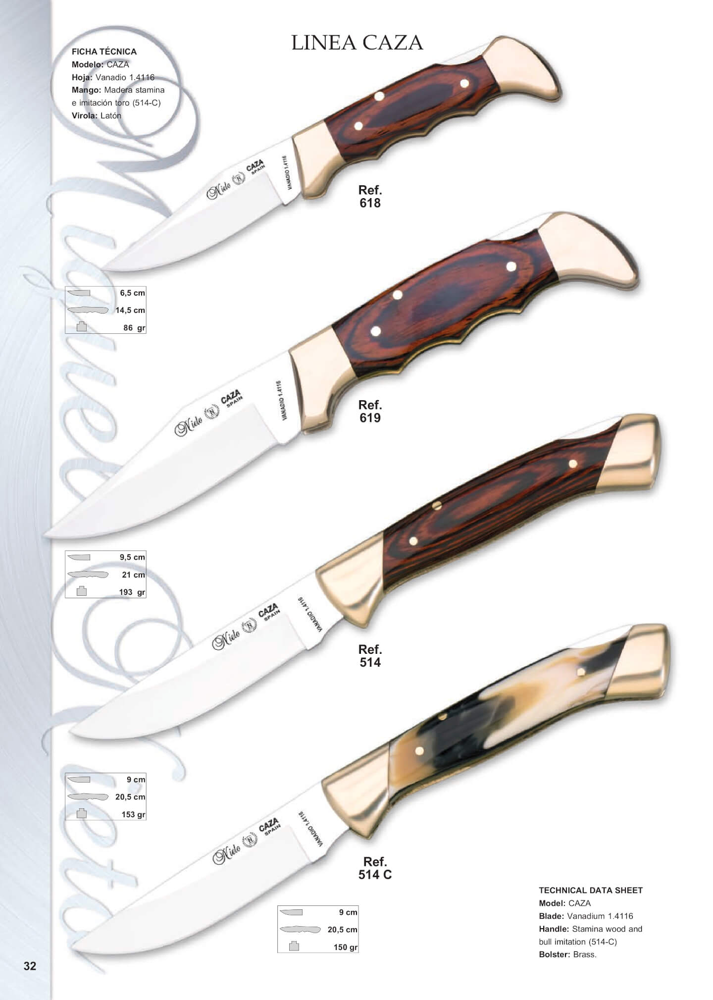 Mango: madera de estamina. Virola: latón. Hoja: 9.5 cm. Longitud total: 21 cm. Peso: 193 grs.