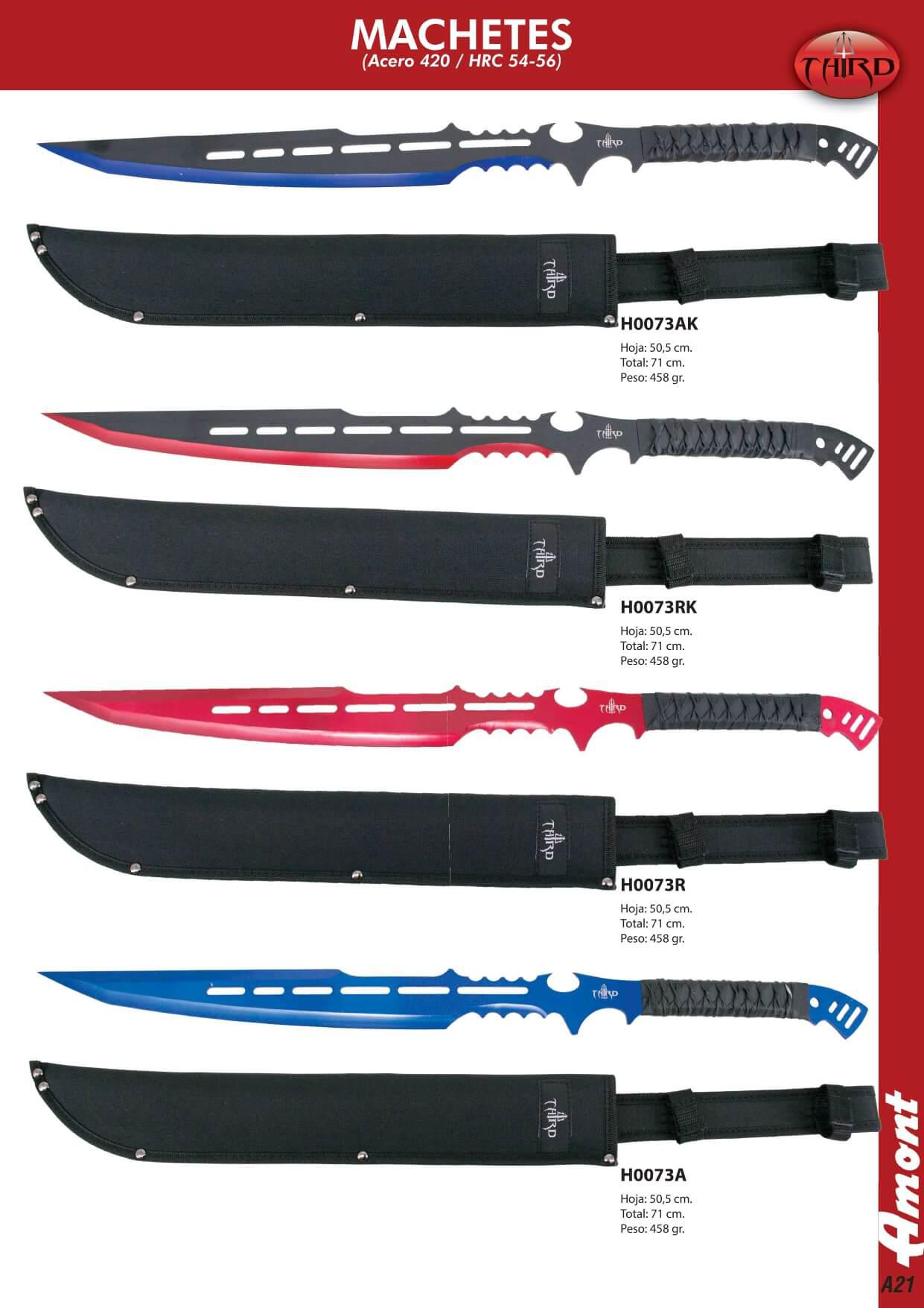 Machetes con hoja de acero 420 de 50,5 cm de longitud. Mango encordado negro y funda de nylon.