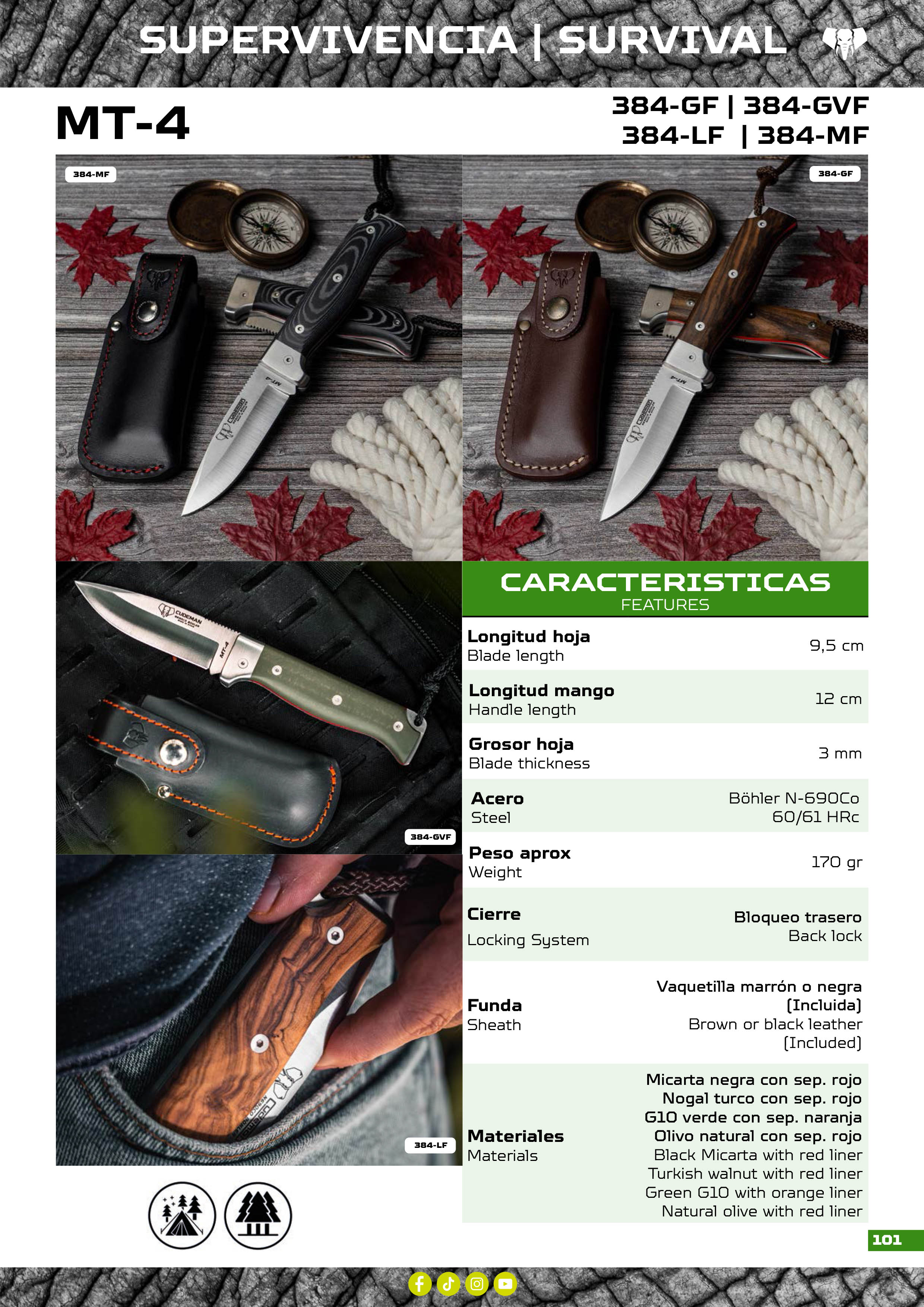 Hoja de acero Böhler N690Co de 10 cm de largo. 3 mm de espesor. Ancho de pala: 2,7 mm. Longitud total: 21,5 cm. Virolas en acero A-304. Bloqueo trasero. Incluye funda de cuero.