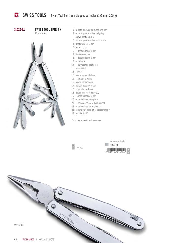 alicate de punta fina, corte para alambre delgado y suave hasta 40 HRC, corte para alambre endurecido, hoja grande, destornillador Phillips 1/2, punzón escariador, gancho multiusos, abrelatas, destornillador 3 mm, destapador, destornillador 6 mm, palanca, curvador de alambres, tijeras, sierra para madera, sierra para metal, lima para metal, destornillador 2 mm, formón de 7 mm y raspador, pela cables corte longitudinal, pela cables corte circular, pela cables y raspador, ojal de fijación.