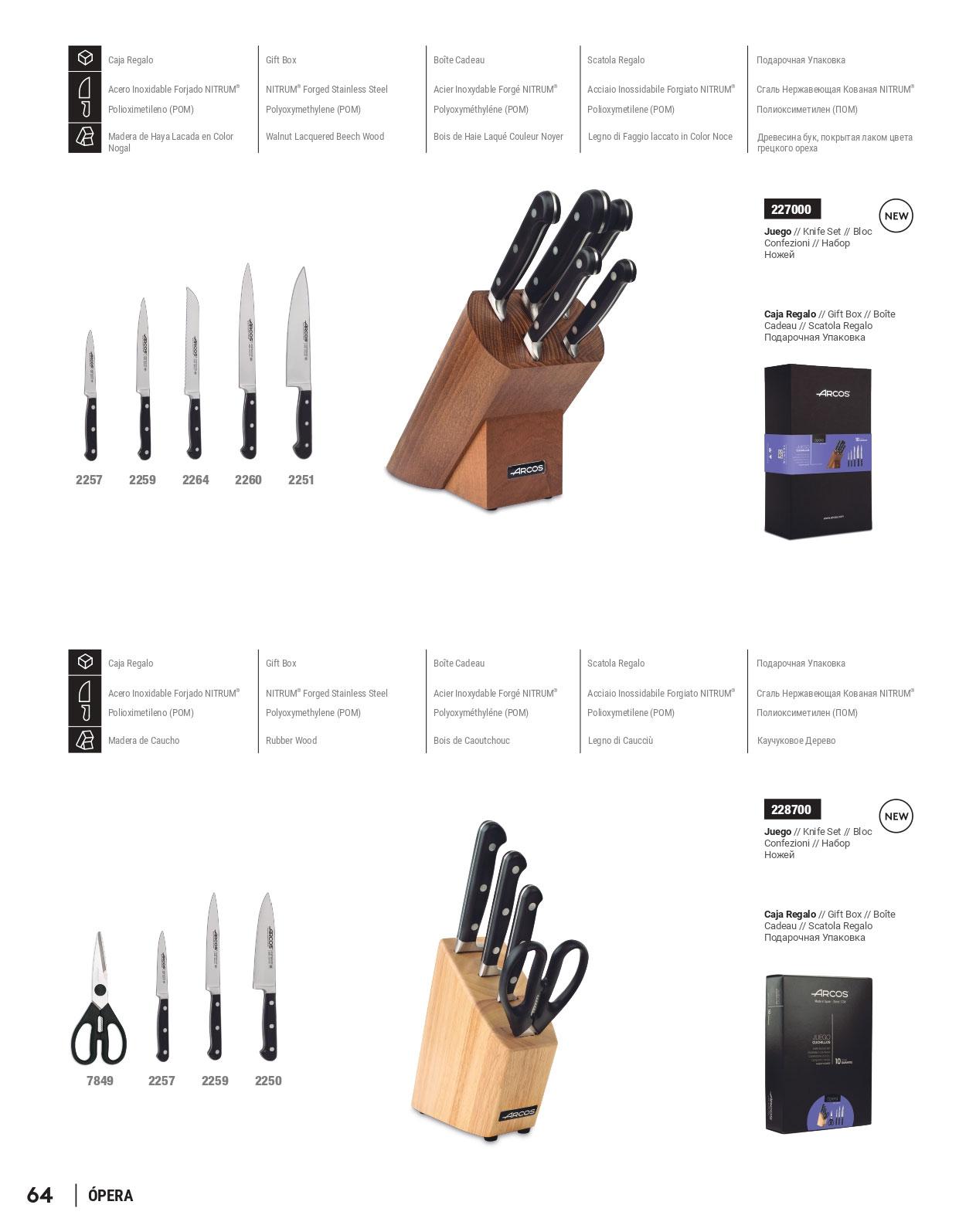 227000 Taco de cocina de 5 piezas: cuchillo cocinero de 21 cm, cuchillo fileteador de 21 cm, cuchillo panero de 18 cm, cuchillo fileteador de 16 cm y cuchillo mondador de 10 cm. Taco de madera de haya lacado en color nogal