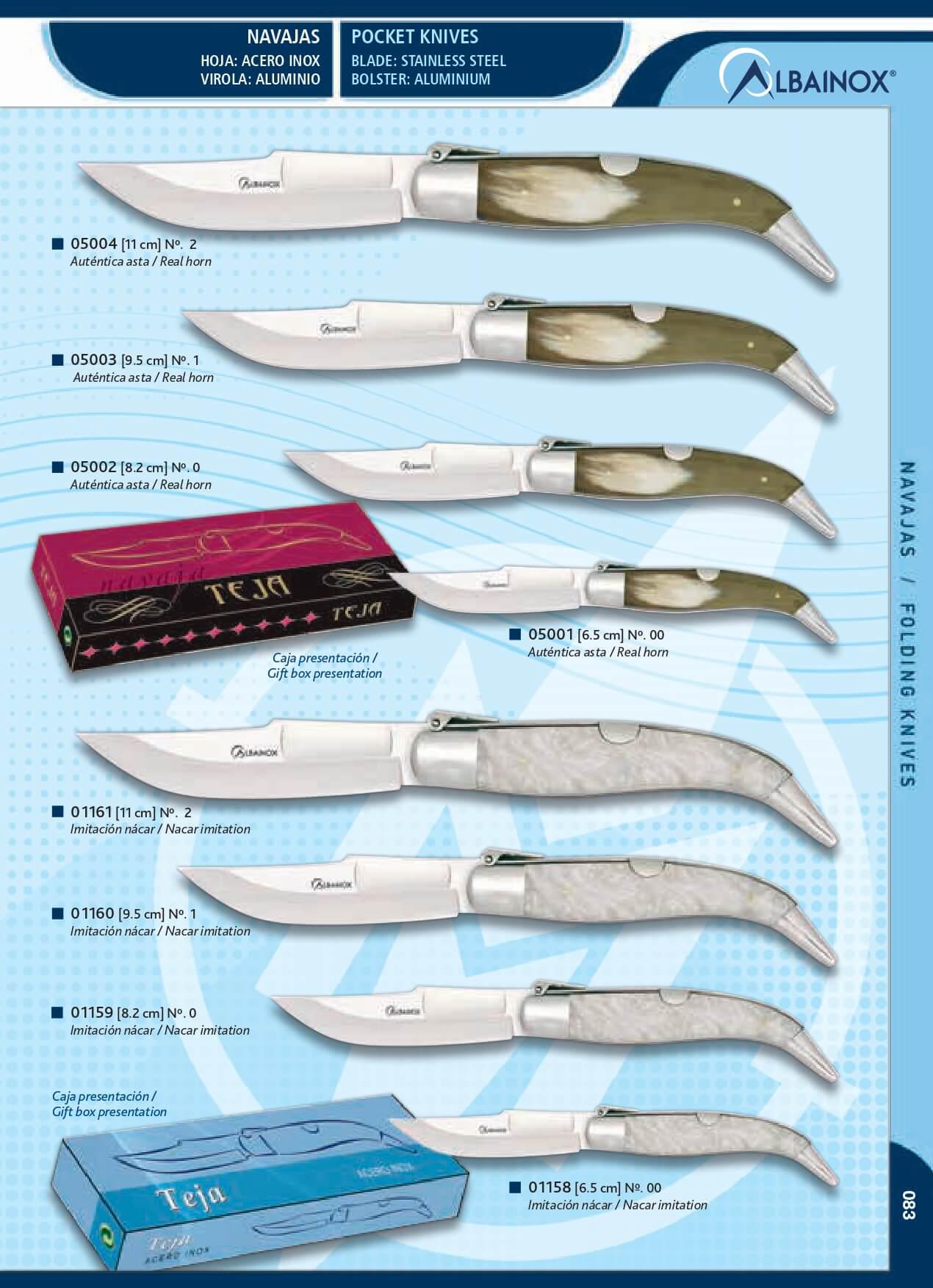 05004, 05003, 05002y 05001: Hoja de acero inox, mango de auténtica asta.