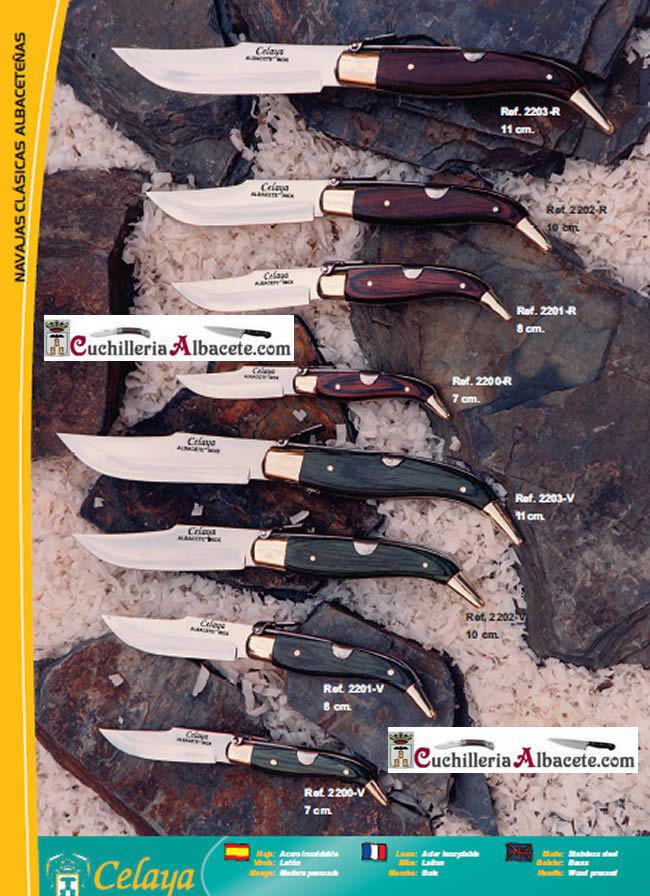 Classic pocket knives from Albacete with stainless steel or carbon steel blade. Pressed wood handle and brass ferrule.
