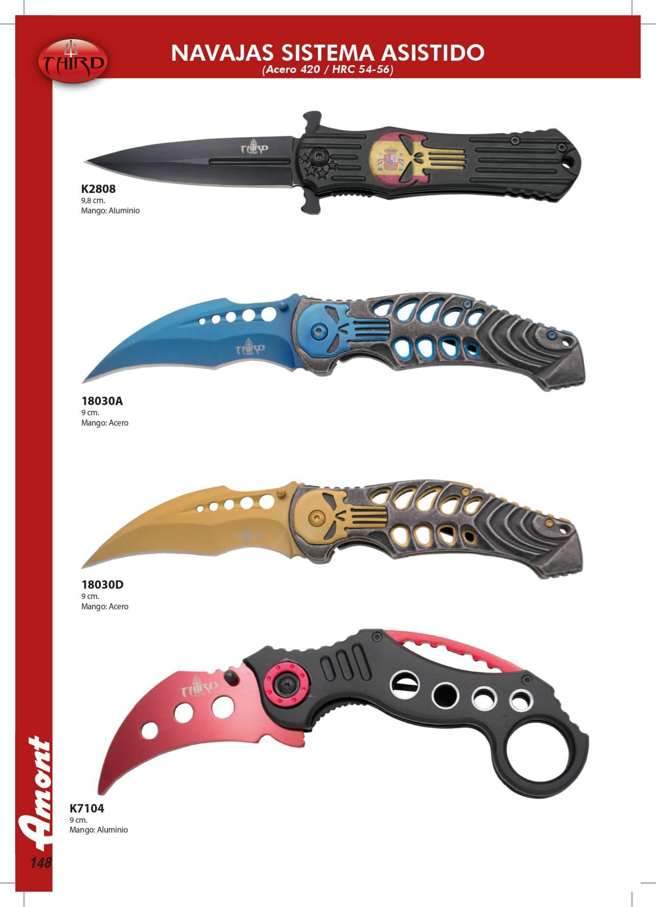 Knives with assisted opening system. K2808 Sheet: 8.5 cm. Handle: aluminum 18030A Sheet: 9 cm Handle: steel 18030D Sheet: 9 cm Handle: steel