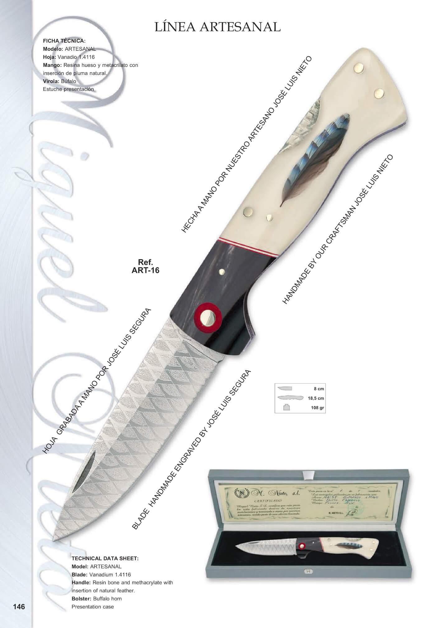 Artisan pocket knife, Model 16 Blade: 1.4116 Vanadium steel. Handle: bone resin and methacrylate with natural pen insert. Buffalo buffalo. Blade length: 8 cm. Total length: 18.5 cm. Weight: 108 grs. Includes presentation case.