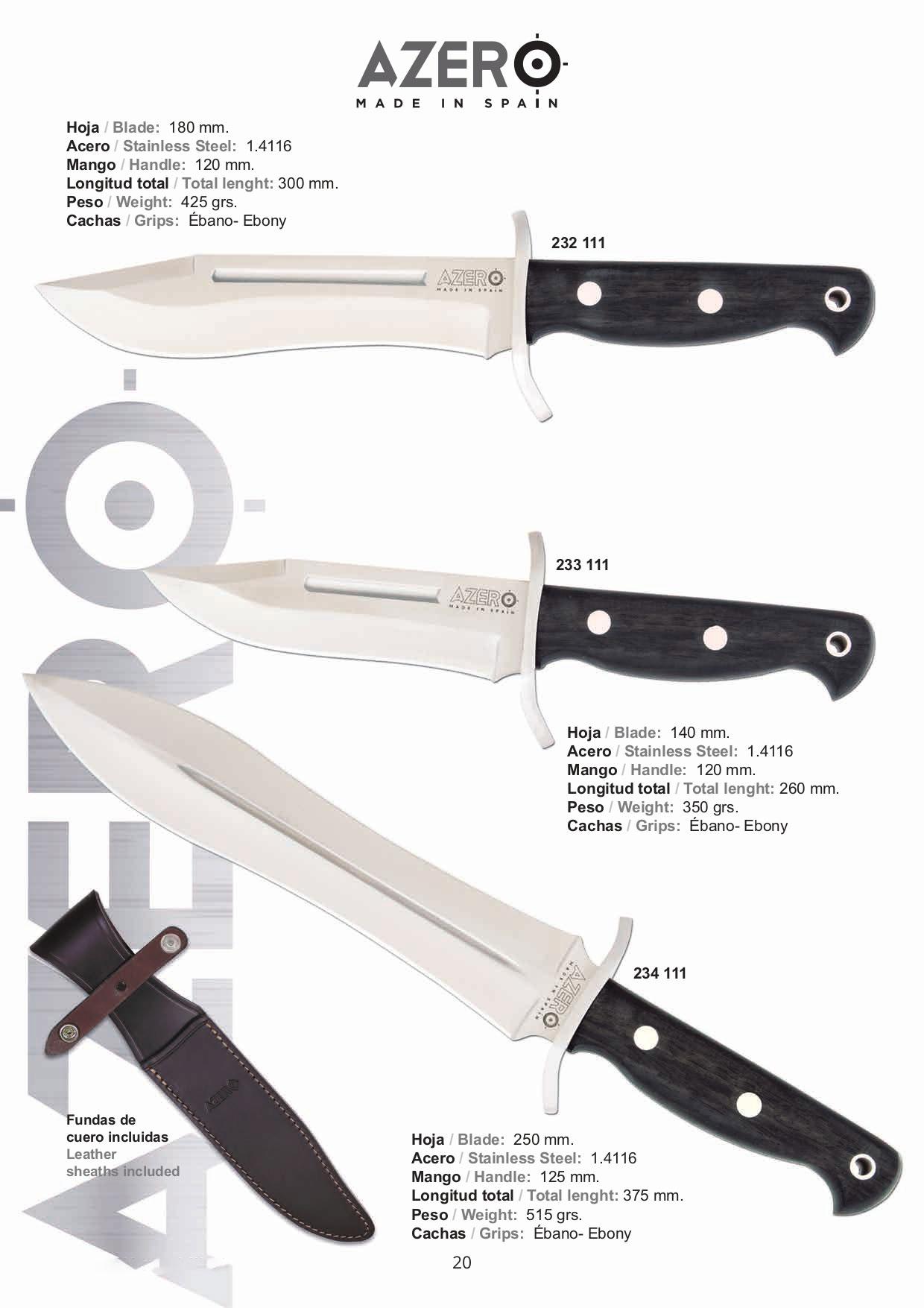 Hunting knives made with ACX-380 stainless steel and ebony wood grips. They include a leather case.