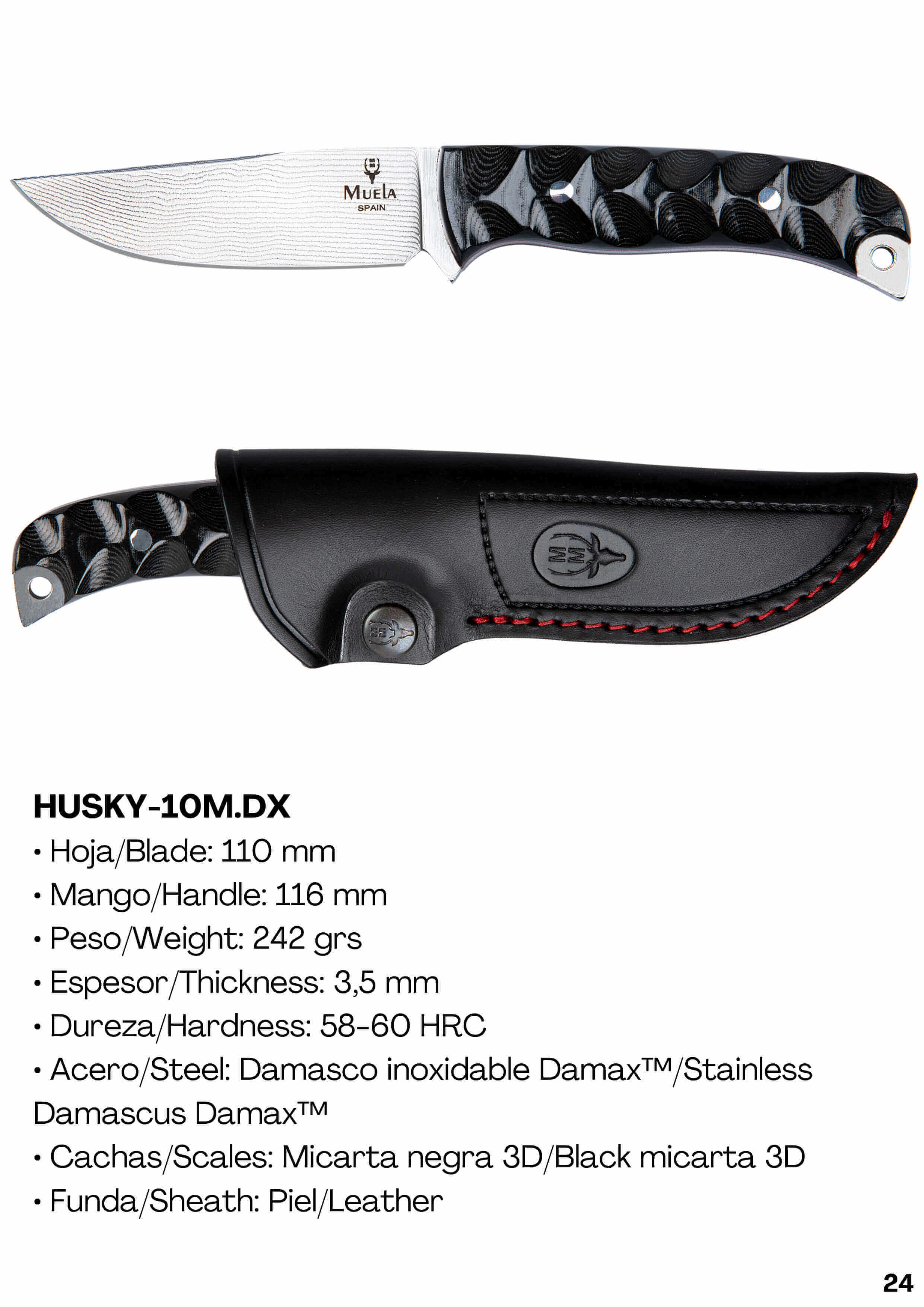Husky-10M.DX knife with damascus steel blade and 3D micarta handle. Perfect knife for collectors and lovers of luxury knives, besides being a totally practical knife when it comes to use in the outside world and activities such as hunting.