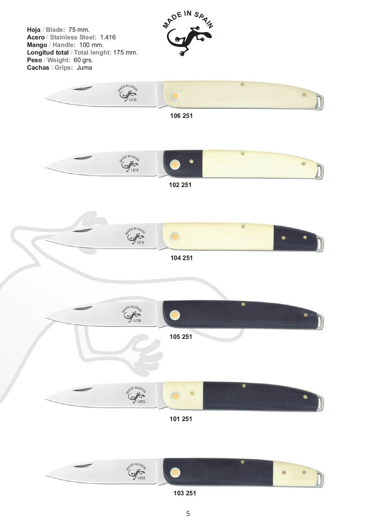 JUMA POCKET KNIVES. Pocket knives with a steel 1.4116 blade of 7.5 cm. Juma grips with different combinations. Handle length: 10mm, open length: 17.5cm. Weight: 60 gr.