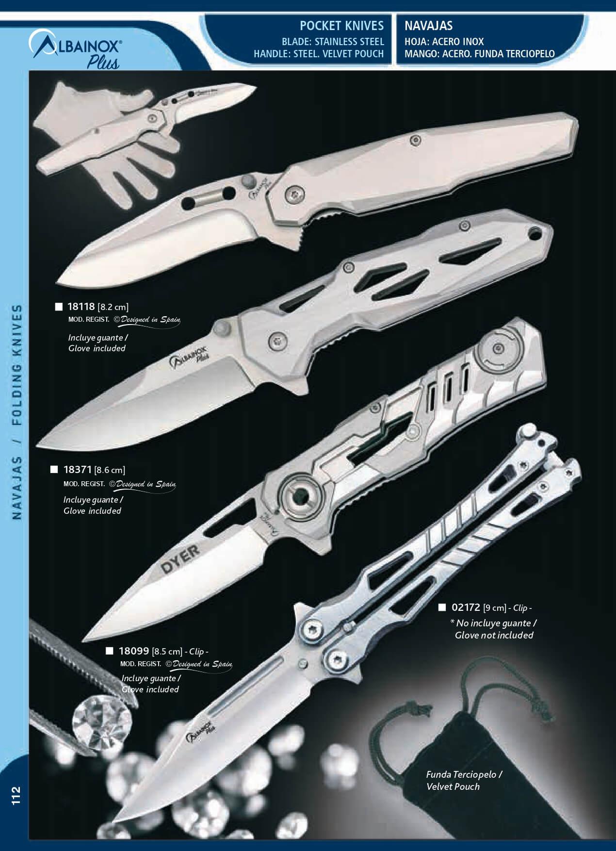 Albainox Plus pocket knife with steel handle, velvet sheath, glov...