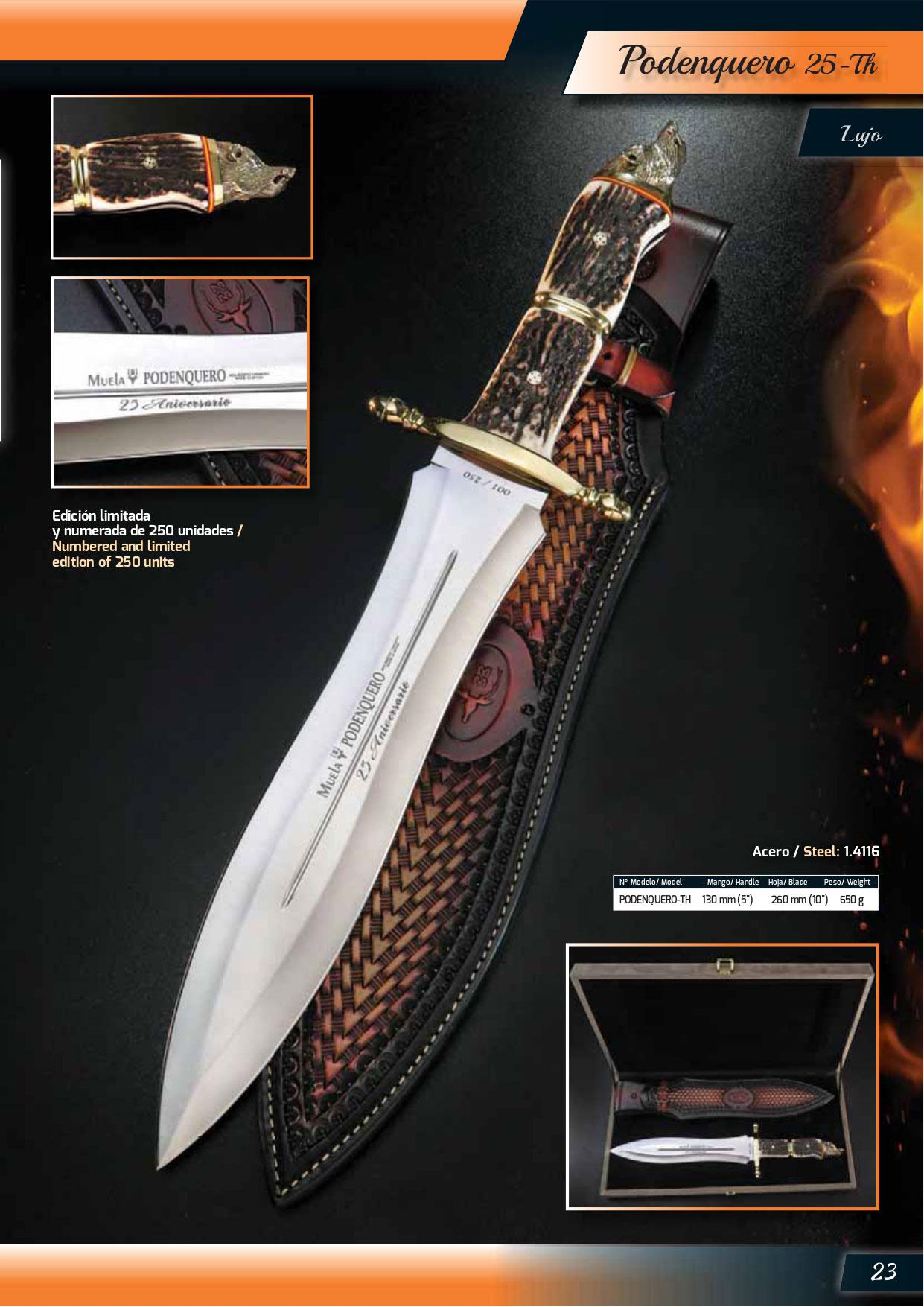 A faca podenquero é uma das facas mais conhecidas de Muela e, por isso, em seu 25º aniversário, eles quiseram homenagear esta nova faca de luxo de edição limitada: Podenquero-25.TH Limitado a 250 cópias.