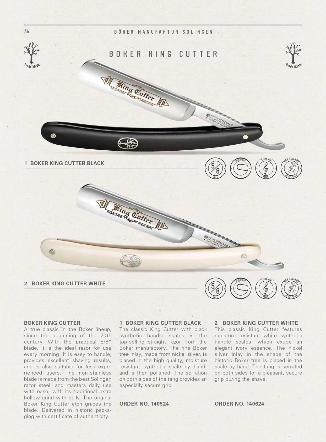 The King Cutter was an integral part of the Boker razor range at the beginning of the 20th century. With its practical 5/8 "blade, it is the ideal knife for every morning, easy to use and with a very good shave result, even for the inexperienced user. The non-rustproof blade is made of the best Solingen razor steel. The blade is made by hand with an extra hollow blade edge with wall. Including authentic Böker stamp in the blade passage.