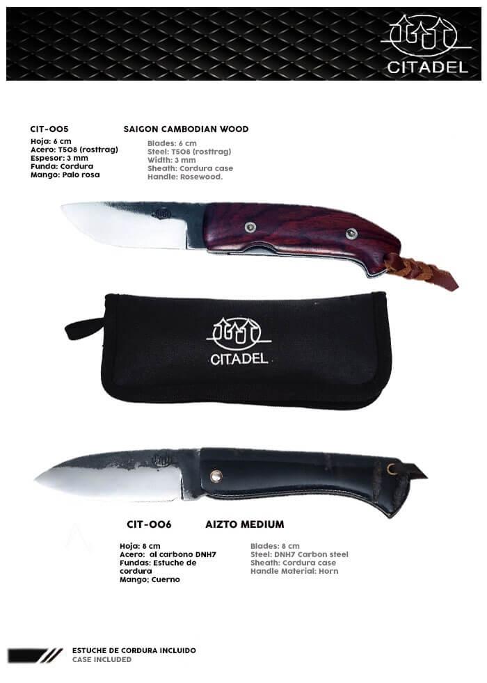 CIT-005: SAIGON CAMBODIAN WOODBlade: 6 cmSteel: T508 (rosttrag)Thickness: 3 mmSheath: CorduraHandle: RosewoodCIT-006: AIZTO MEDIUMBlade: 8 cmSteel: DNH7 Carbon steelThickness: 3 mmSheath: Cordura caseHandle: Horn