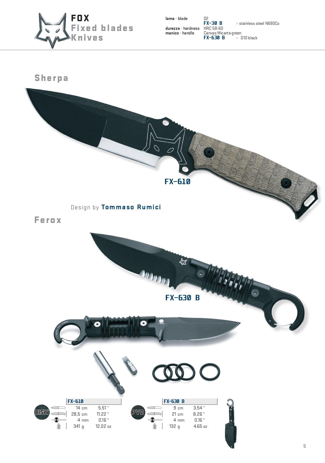 Sherpa tactical knife , designed by Tommaso Rumici. D2 steel blade with drop-point tip. Blade length: 14 cm, total length 28.5 cm, blade thickness 4 mm. Weight 341 gr.