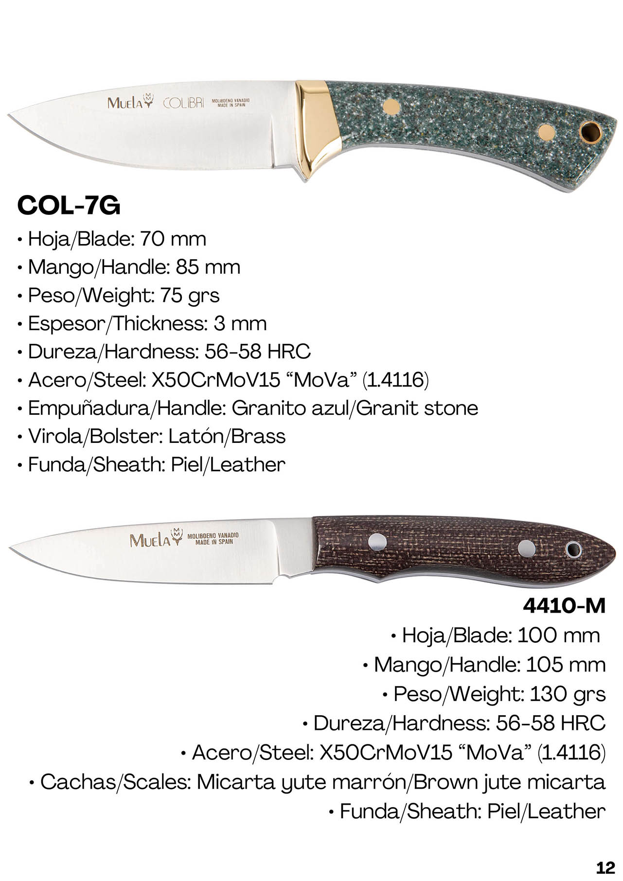 Colibrí knife with a 7 cm blade and blue granite handle. Leather sheath.