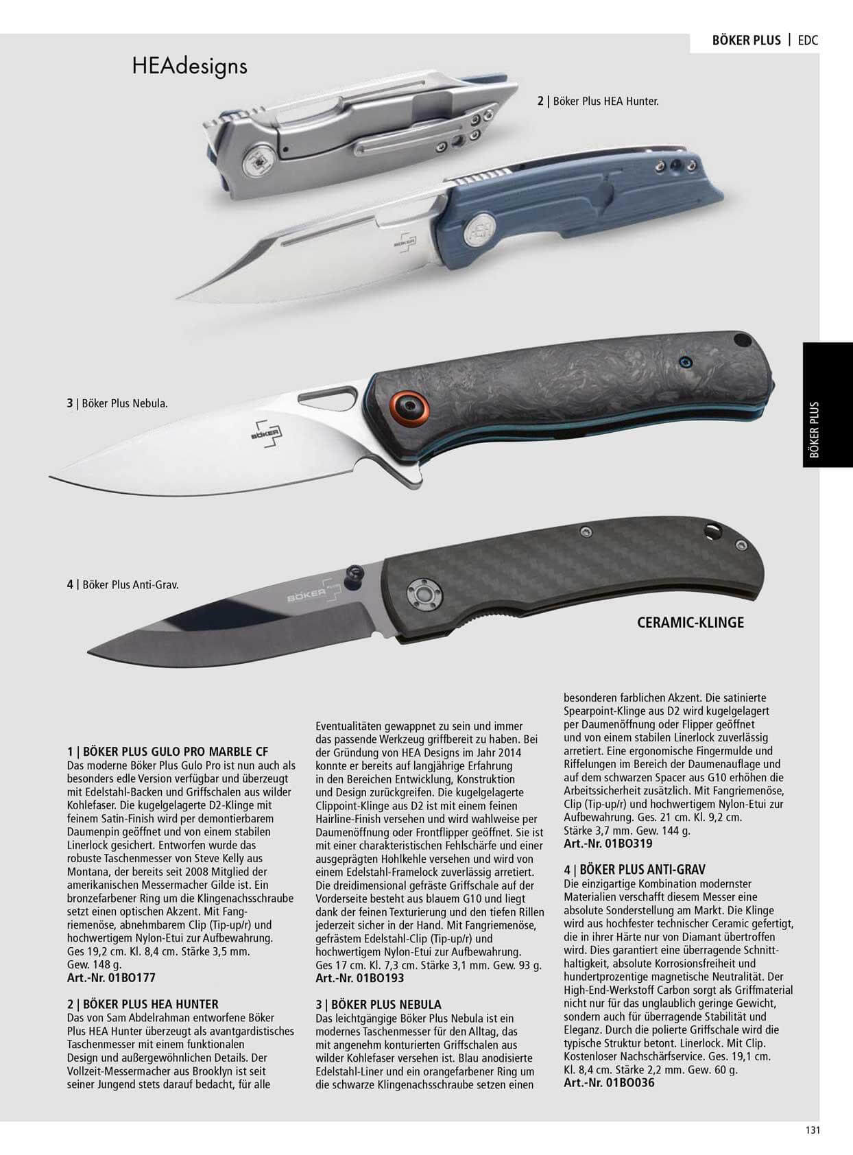Boker Plus HEA Hunter convinces as an avant-garde pocket knife with a functional design and extraordinary details. The ball-bearing clip point blade made of D2 has a fine hairline finish and can be opened either with a thumb opening or a front flipper. It has a characteristic ricasso and a pronounced fuller and is reliably locked by a stainless steel frame lock. The three-dimensionally milled handle shell on the front is made of blue G10 and thanks to the fine texturing and the deep grooves it always sits securely in the hand. With lanyard hole, milled stainless steel clip (tip-up/r) and high-quality nylon case for storage.