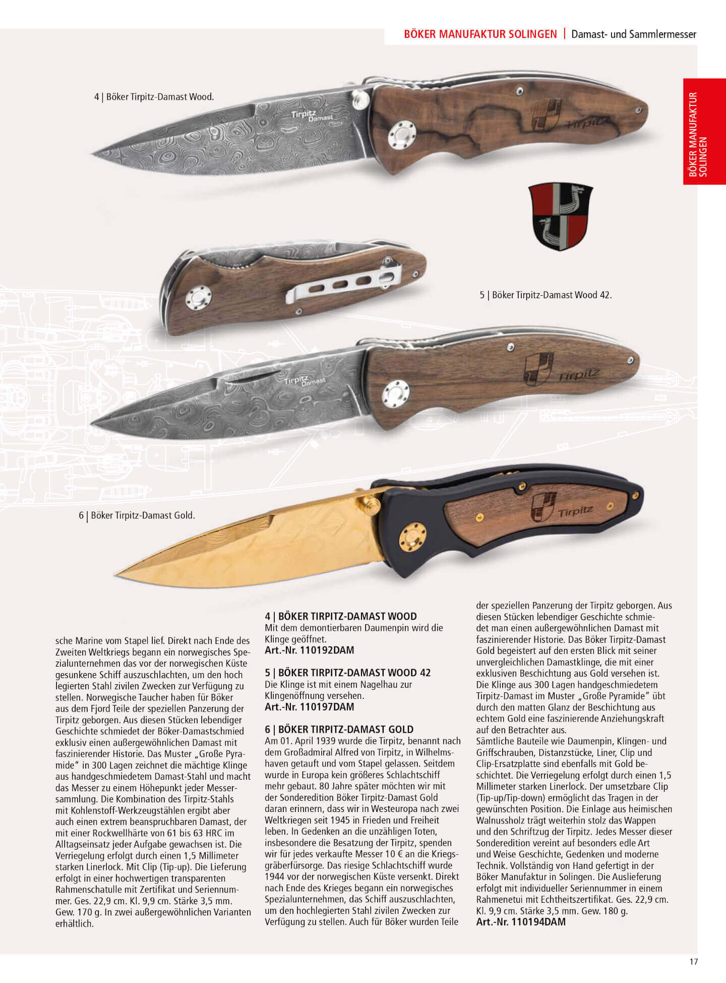 These knives are made with a Tirpitz damascus steel blade, this steel is obtained with parts of the imposing Tirpitz battleship, the largest used in Europe up to now, which sank off the coast of Norway in 1944, years later Boker rescued parts of the himself to manufacture its imposing Tirpitz Damascus, which thanks to its combination with carbon steels achieve great hardness, which together with its beauty makes it a high-quality collector's knife.