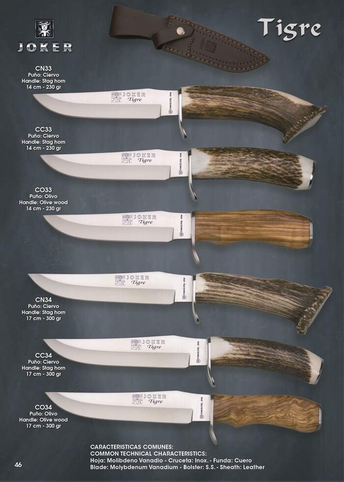 Lames en acier Molybdène Vanadium de 14 et 17 cm. Croix en acier inoxydable. Poignées en bois d'olivier et bois de cerf.