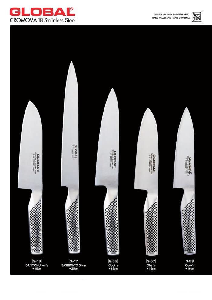 Couteaux japonais monoblocs mondiaux. Lame en acier inoxydable CROMOVA 18, cet acier à haute composition en chrome a une haute résistance à l'oxydation et une dureté de 56º-58º HRC.
