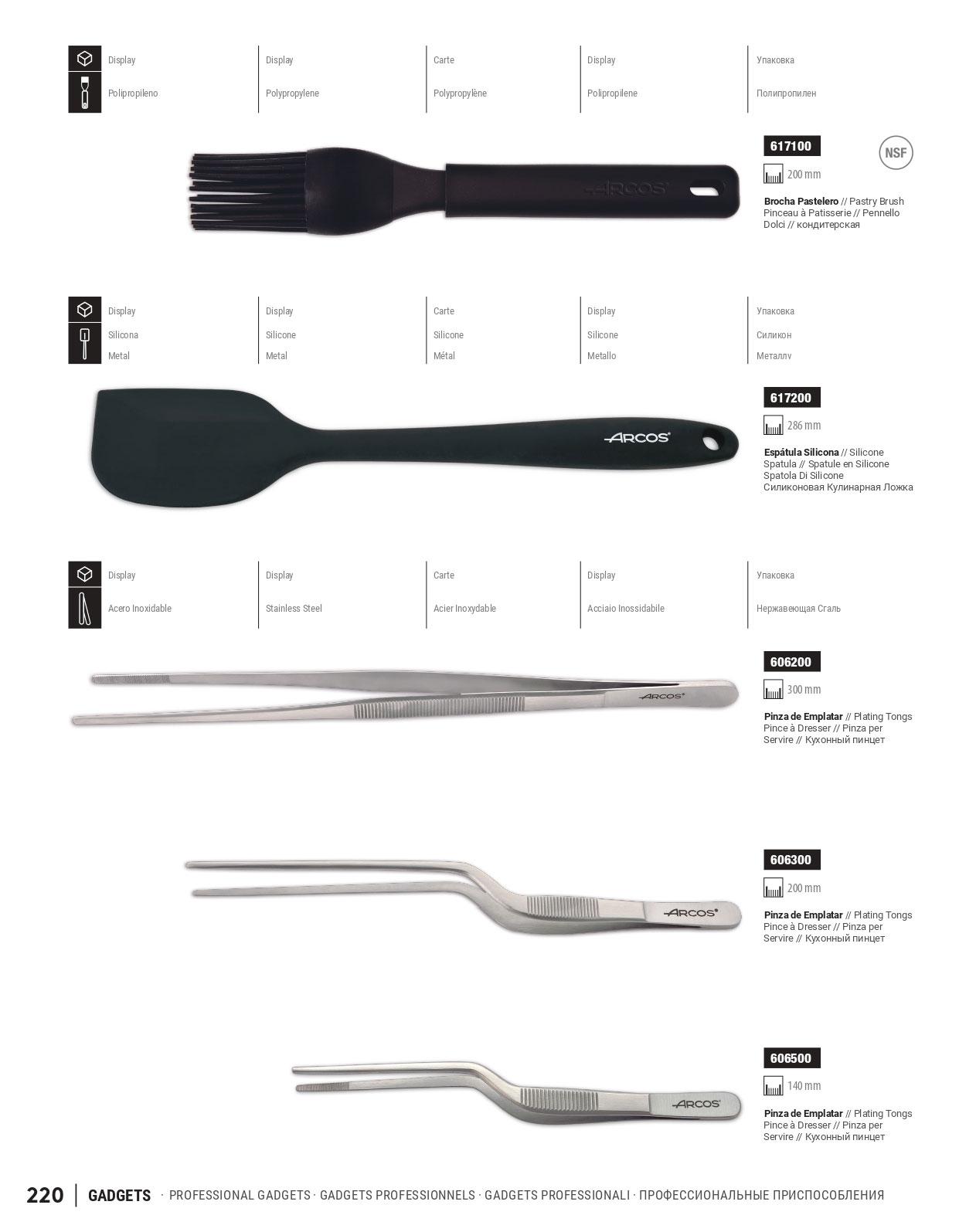 Ustensiles de cuisine. Pinceau à pâtisserie en polypropylène. Spatule en silicone avec intérieur métallique. Pince à placage en acier inoxydable.