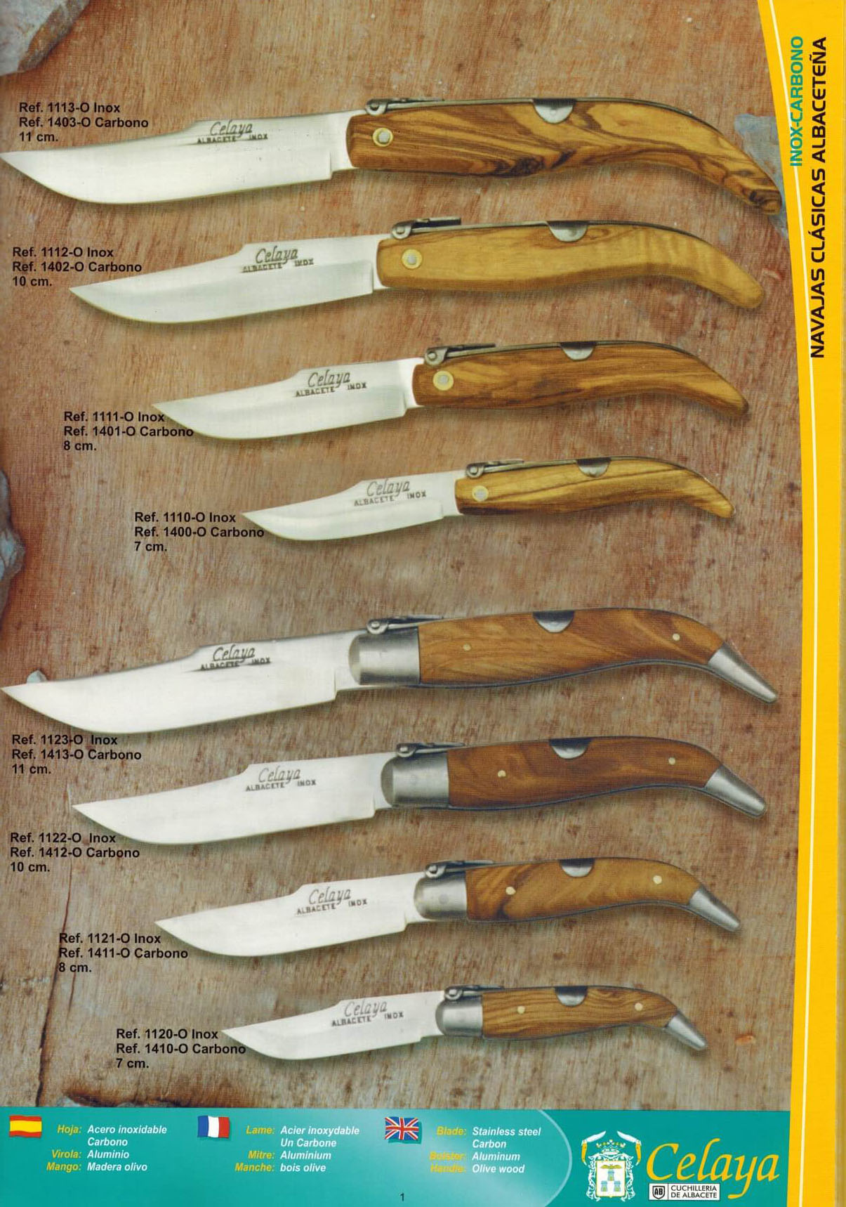 1413-O, 1412-O, 1411-O, 1410-O Couteau de poche classique Albacete avec lame en acier au carbone et manche en bois d'olivier avec virole en aluminium.