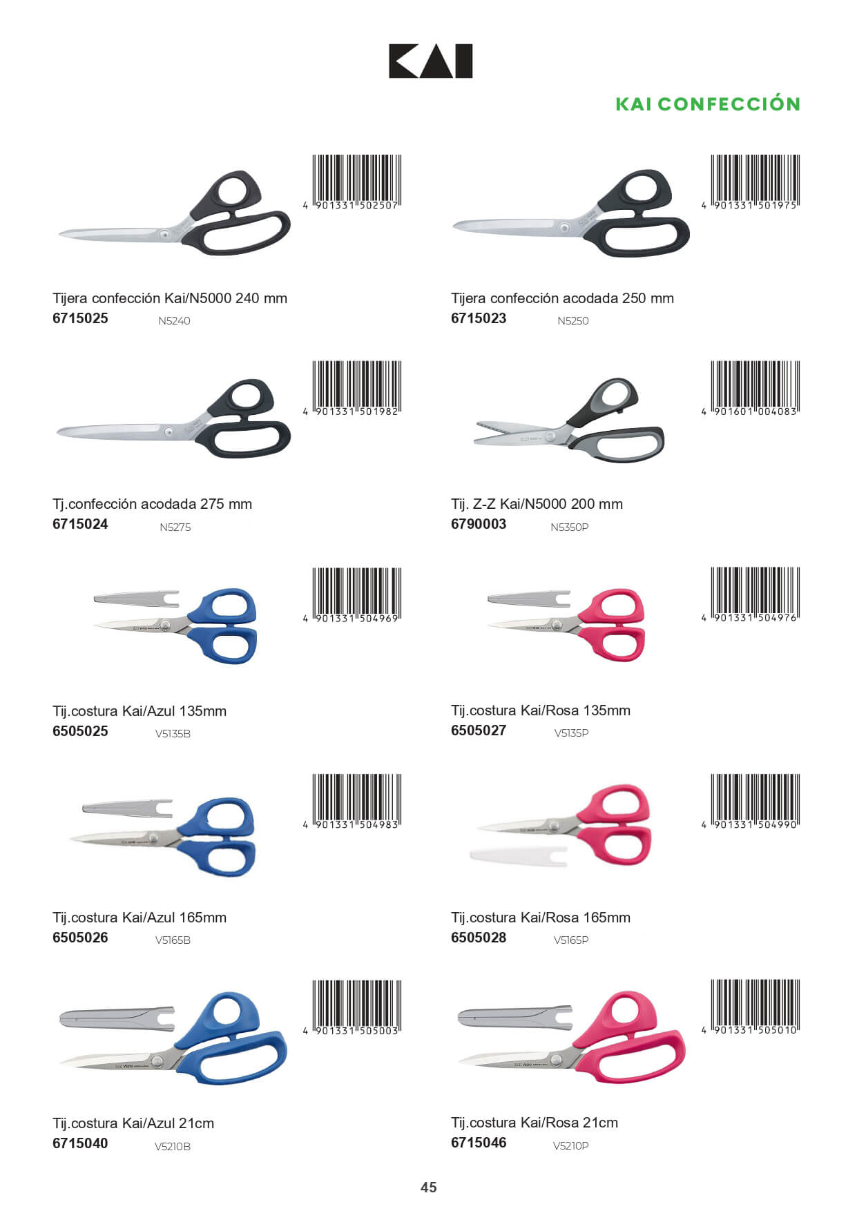 Kai ciseaux de couture sont conçus pour les applications professionnelles et pour un usage quotidien à la maison. Les lames en acier inoxydable NSSWR-2 ont une dureté de 56 ± 1 HRC. Les ciseaux sont finition satinée.