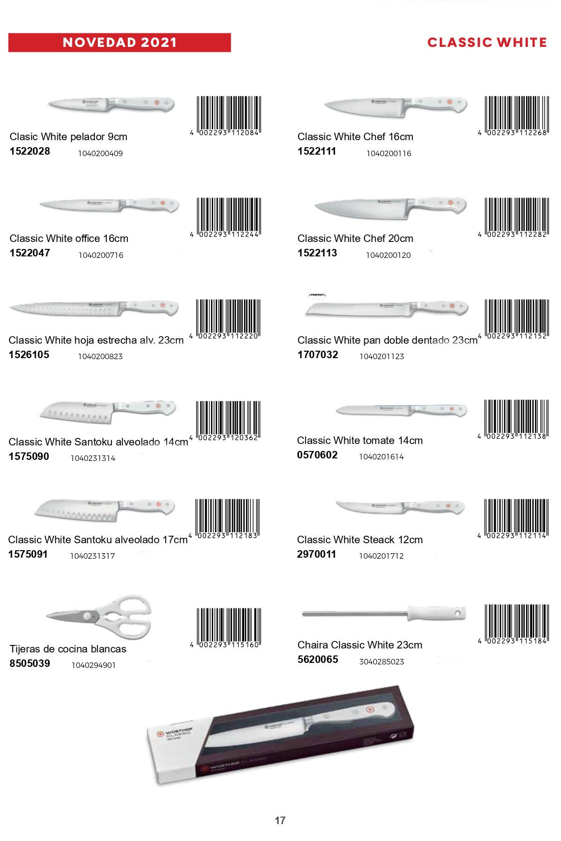 Classic White dispose actuellement de 9 couteaux, d'un aiguiseur et d'une paire de ciseaux. De plus, il dispose d'un bloc exclusif pour la série. Toutes les lames Classic White sont affûtées avec la technologie brevetée PEtec.