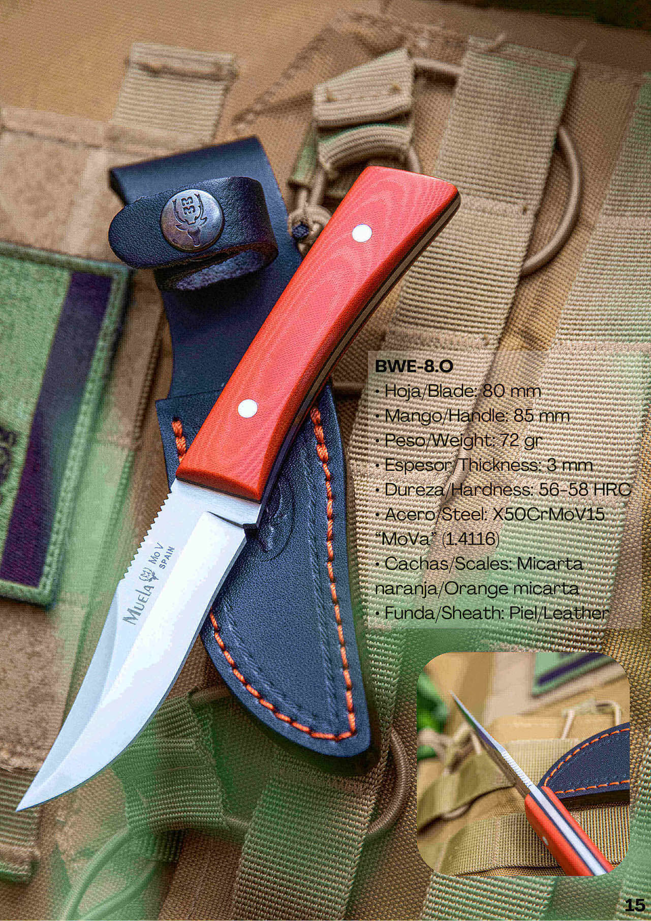 Couteau pleine soie avec manches en micarta orange avec séparateurs noirs et une lame pleine soie en acier MoVa 1.4116 de 8 cm. Comprend un étui en cuir noir.