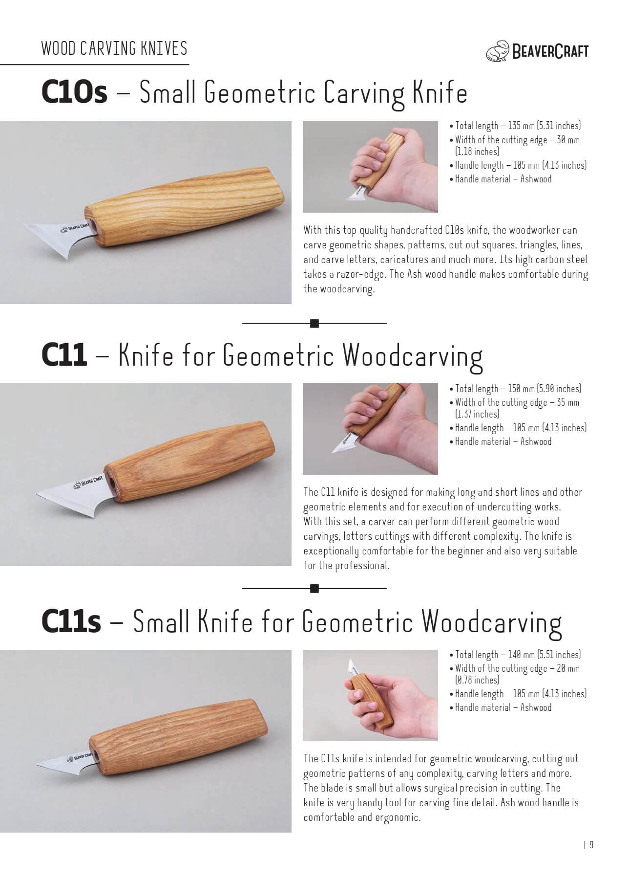 Couteaux à sculpter fabriqués à la main avec des manches en bois de frêne et des lames en acier au carbone. Ces couteaux sont spécialement conçus pour sculpter des formes géométriques, des motifs et d'autres formes. Les lames sont petites pour permettre un peu plus de précision. Ils sont très confortables et faciles à tenir en main.