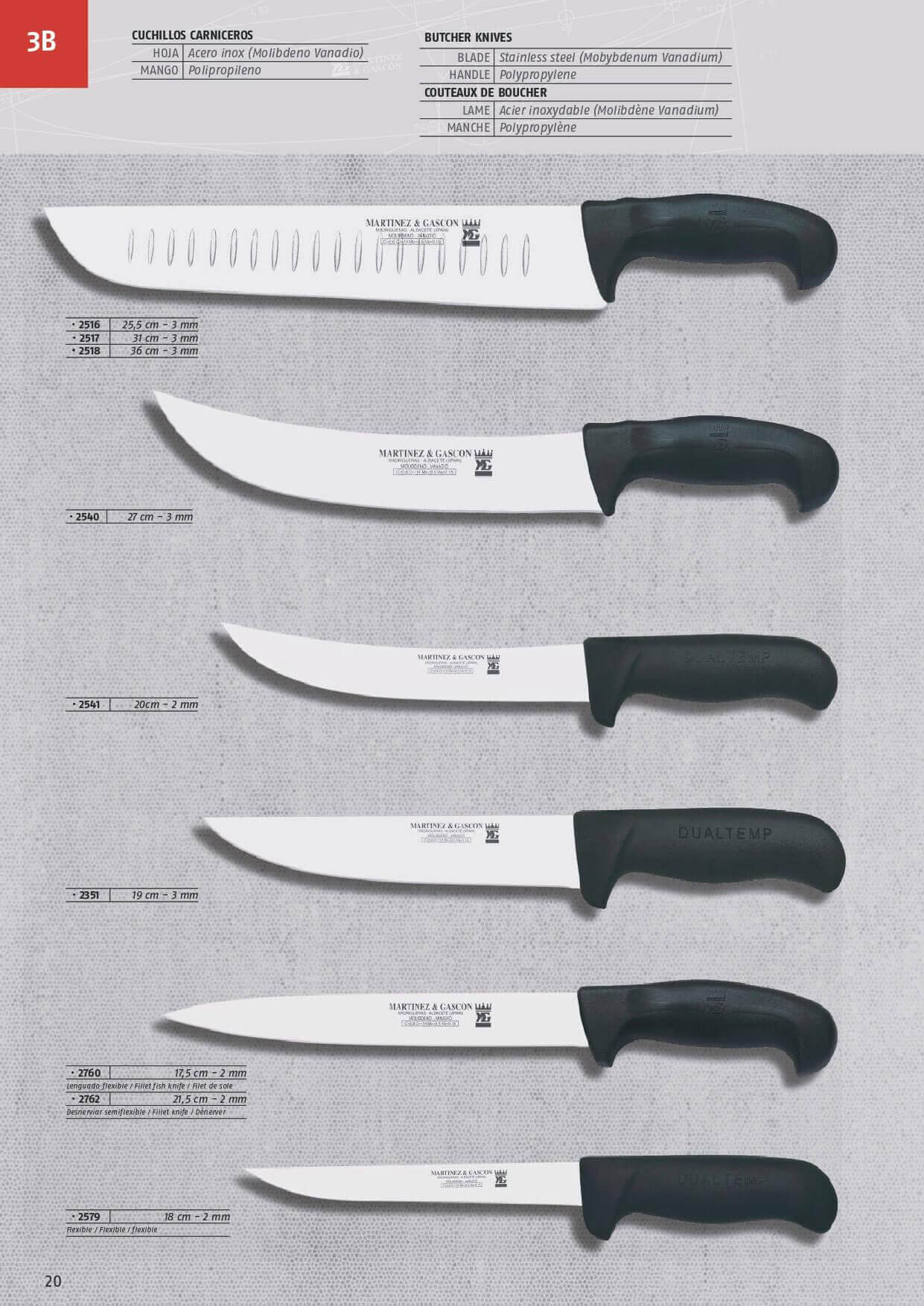 Couteaux de boucher avec lame en acier inoxydable et poignée en polypropylène. Couteau alvéolé. Couteau à dépecer. Couteau à fileter. Filet de sole. Couteau à fileter flexible supplémentaire.
