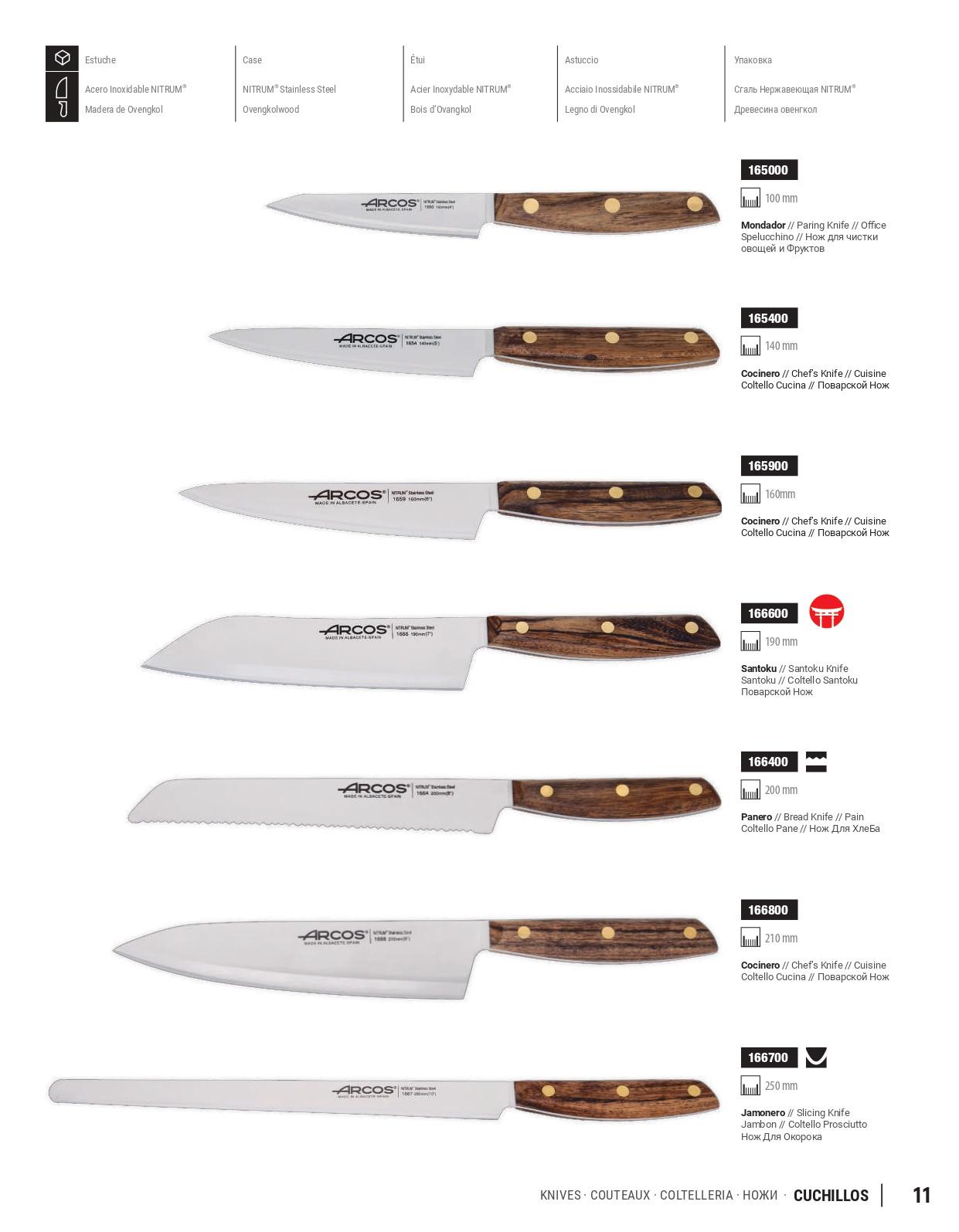 Cette collection comprend un couteau d'office, des couteaux de chef de différents modèles et tailles, un couteau à pain, un couteau à jambon et un santoku.