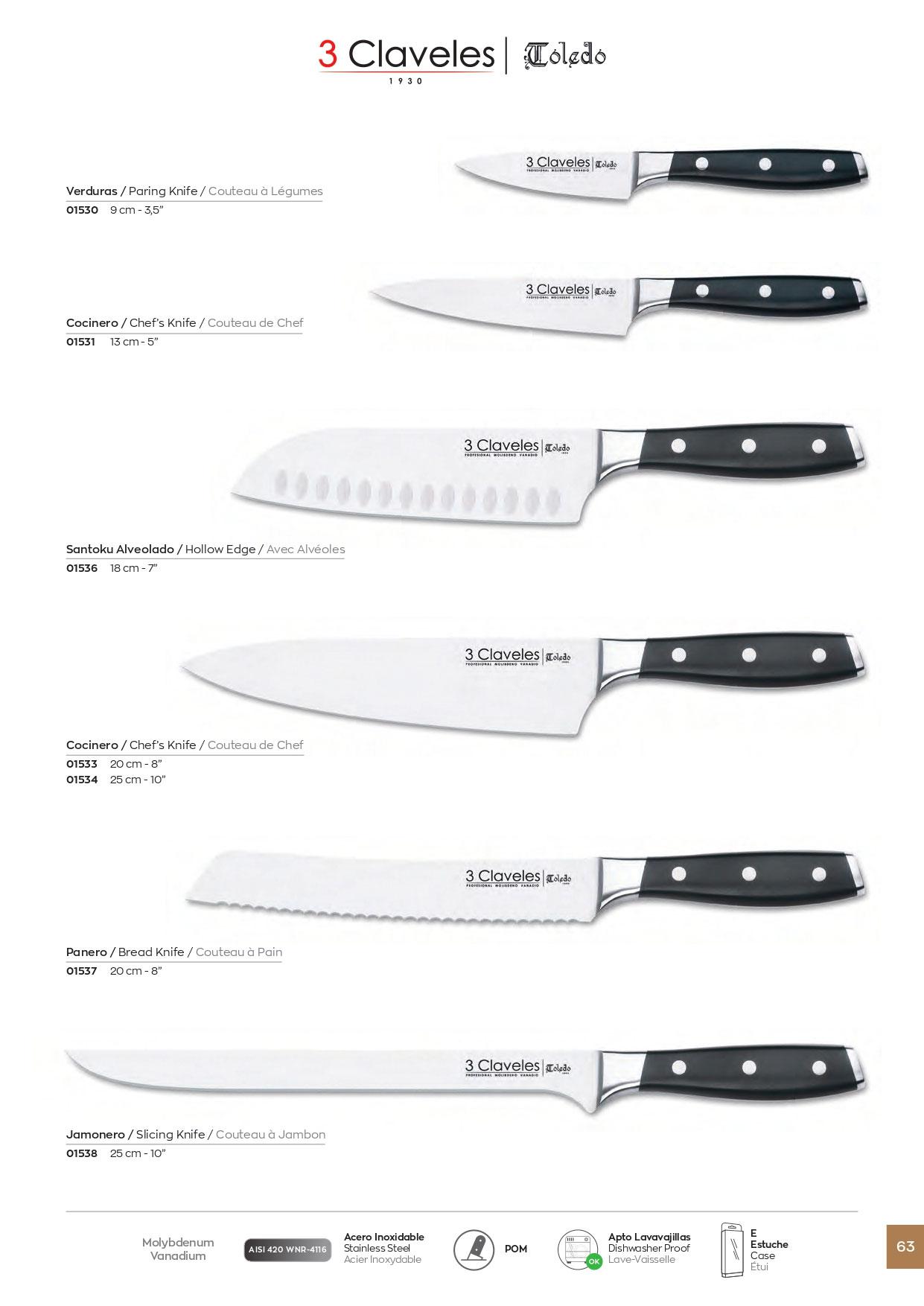 Couteaux forgés en acier inoxydable AISI 420 WNR-4116. Poignée POM ergonomique, résistante et confortable. Lame en acier inoxydable et poignée en POM. Couteau à légumes, cuisinier, pain, Santoku.