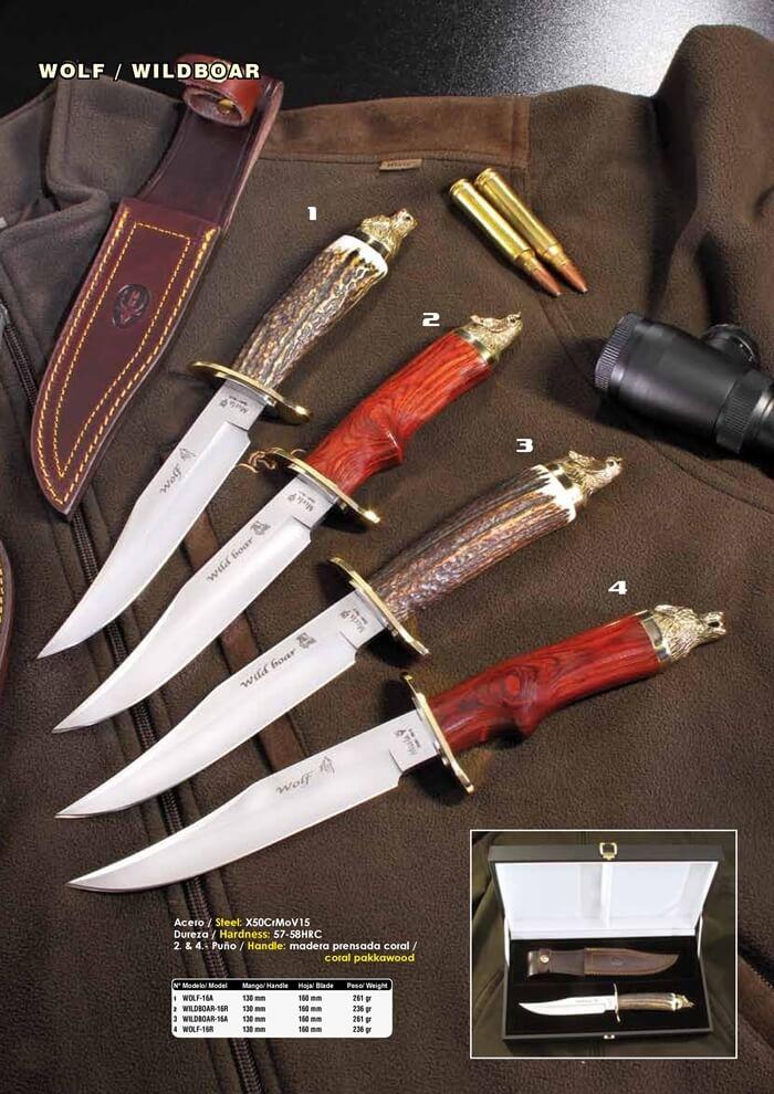 Couteau de chasse artisanal en bois de cerf, avec la défense en laiton et acier inoxydable.