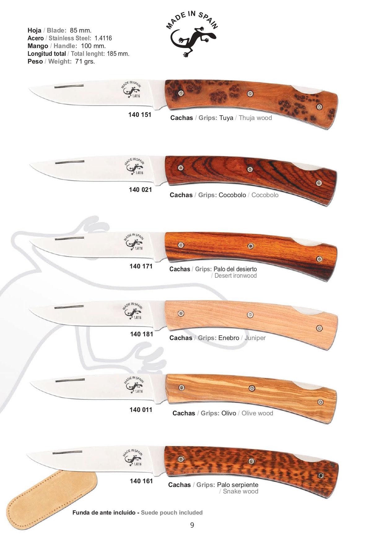 Couteaux de la coutellerie Albacete Salamandra. Avec lame en acier 1.4116 de 8,5 cm. Anse de 10 cm, longueur ouverte 18,5 cm et 71 g de poids. Verrouillage du bouton de retour. Comprend une housse en daim.