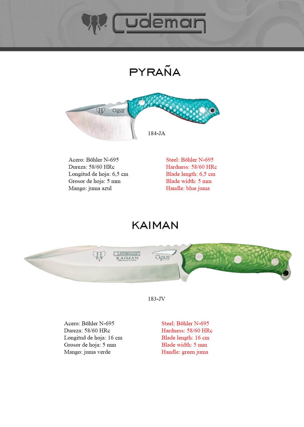 Couteaux tactiques avec lames en acier Bohler N695 et manche en juma bleu avec espaceur orange ou manche en juma vert avec espaceur noir. Étui en cuir inclus.