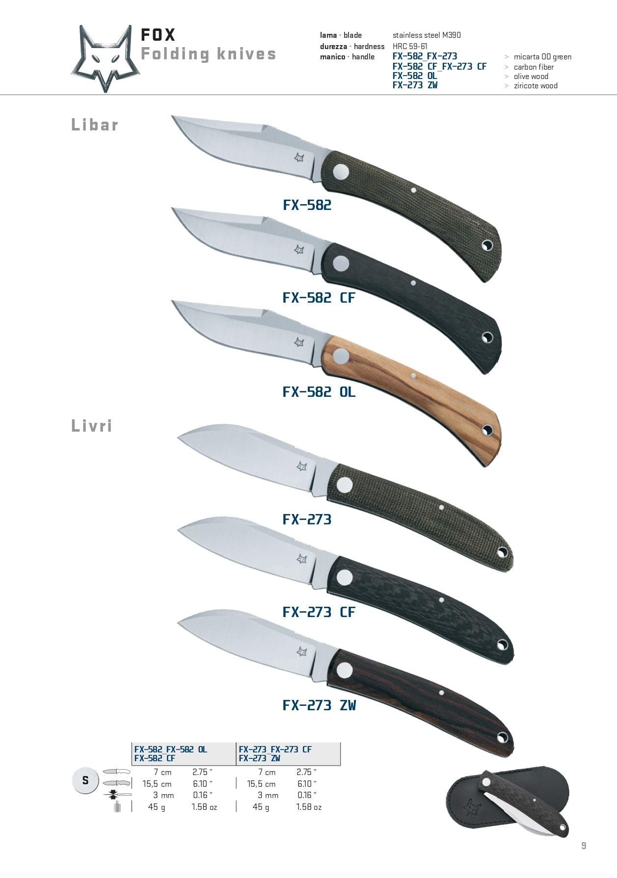 FX-582 Manche en micarta vert. FX-582 CF Manche en fibre de carbone. FX-582 OL Manche en bois d'olivier.