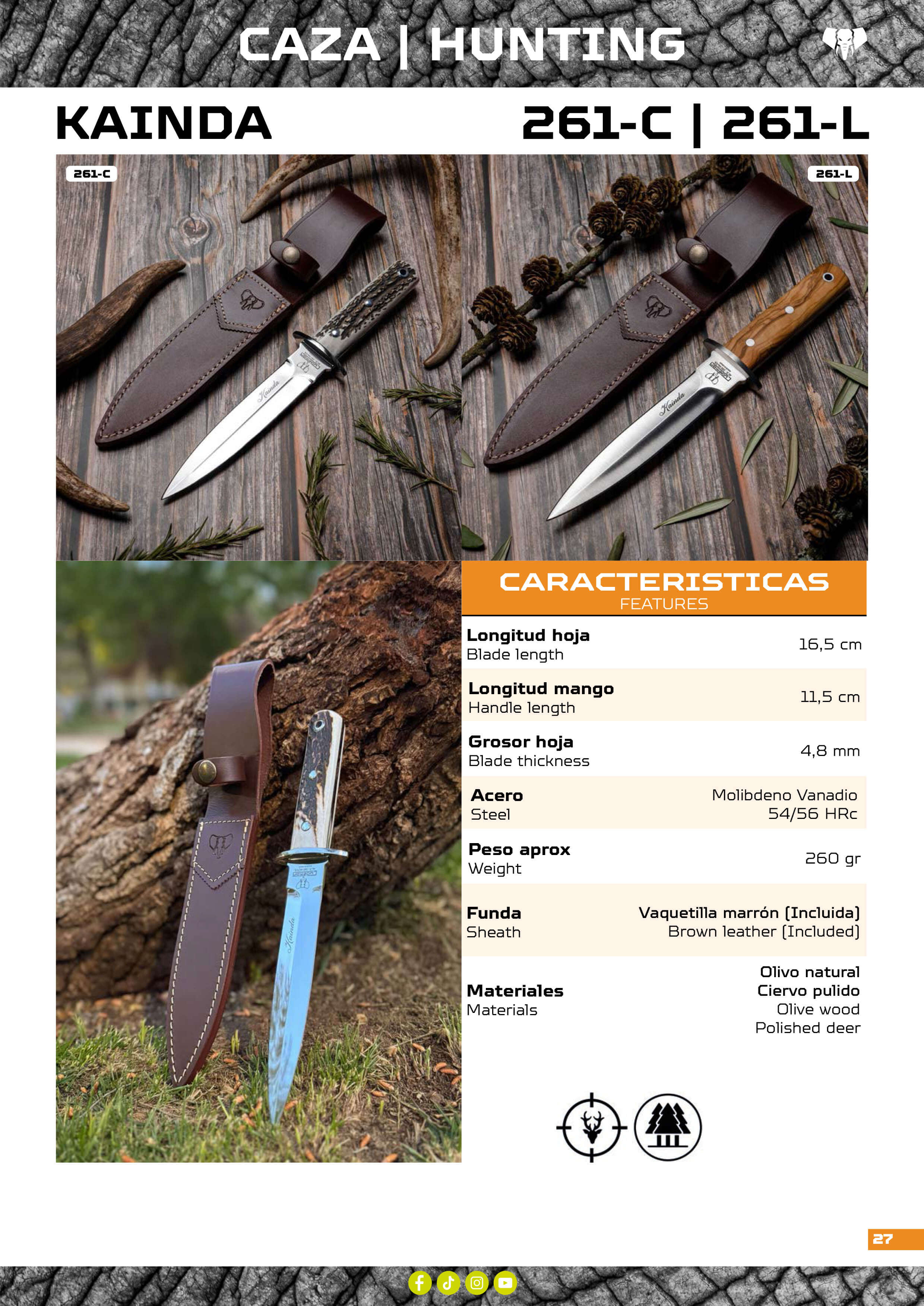 261-C Écailles de bois de cerf. Longueur de lame: 11,5 cm. Longueur totale: 28 cm. Largeur de la pelle: 2,5 cm. Poids: 282 gr.