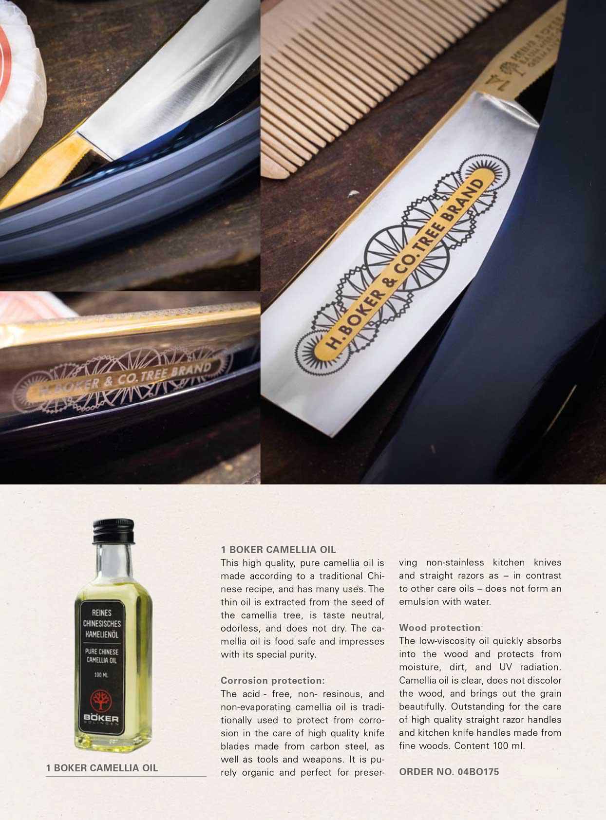 L'huile de camélia Boker pure et de haute qualité est produite selon des recettes chinoises traditionnelles et peut être utilisée de nombreuses façons. L'huile fine est obtenue à partir des graines du camélia, est insipide, inodore et ne sèche pas. L'huile de camélia est sans danger pour les aliments et convainc par sa pureté particulière. Protection contre la corrosion: L'huile de camélia sans acide, non résinifiante et non volatile est traditionnellement utilisée comme agent de protection contre la corrosion pour l'entretien des lames de couteau de haute qualité en acier au carbone ainsi que des outils et des armes nues.