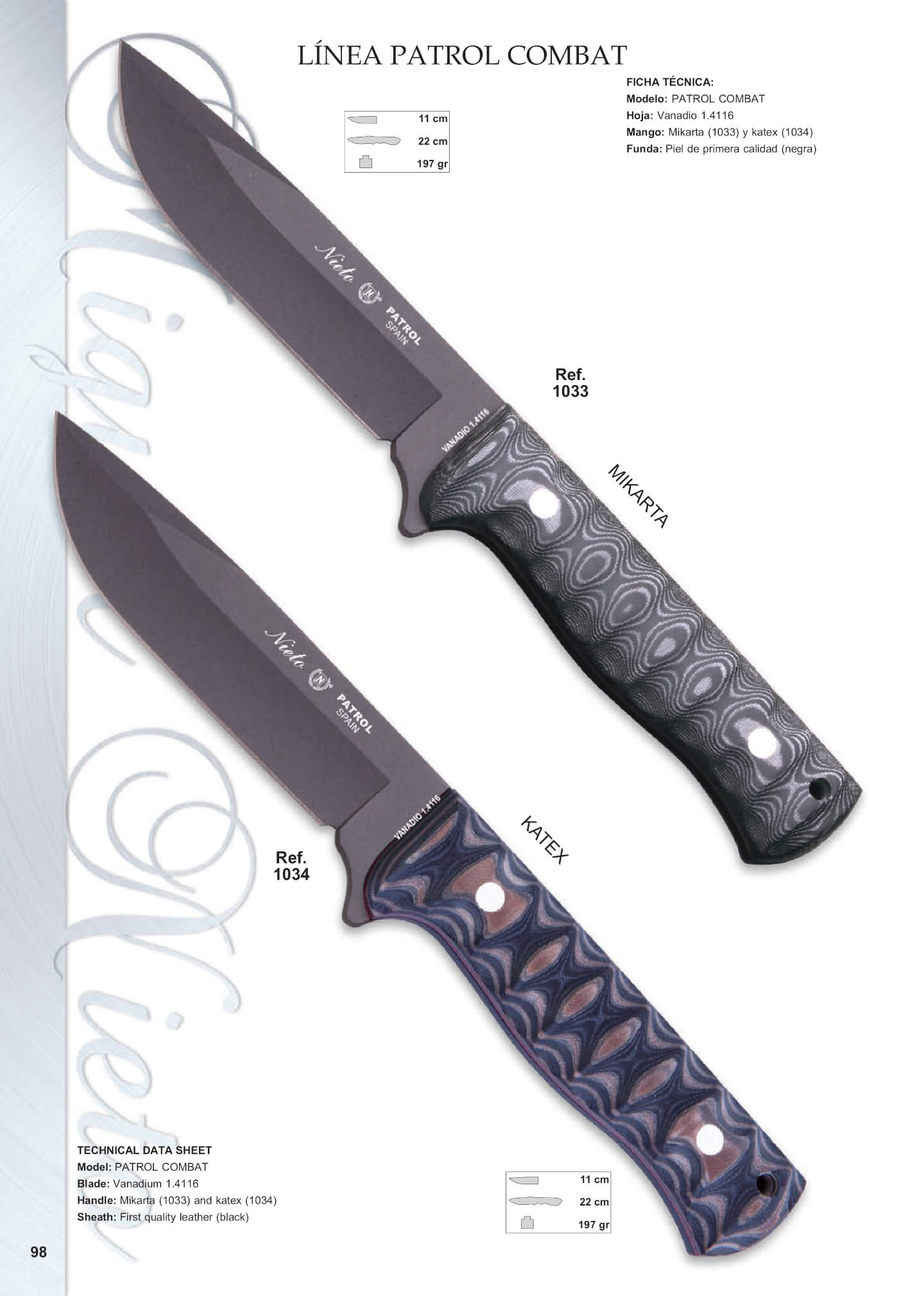 Lame: 11 cm. Longueur totale: 22 cm. Poids: 197 grs. Poignée: Mikarta.