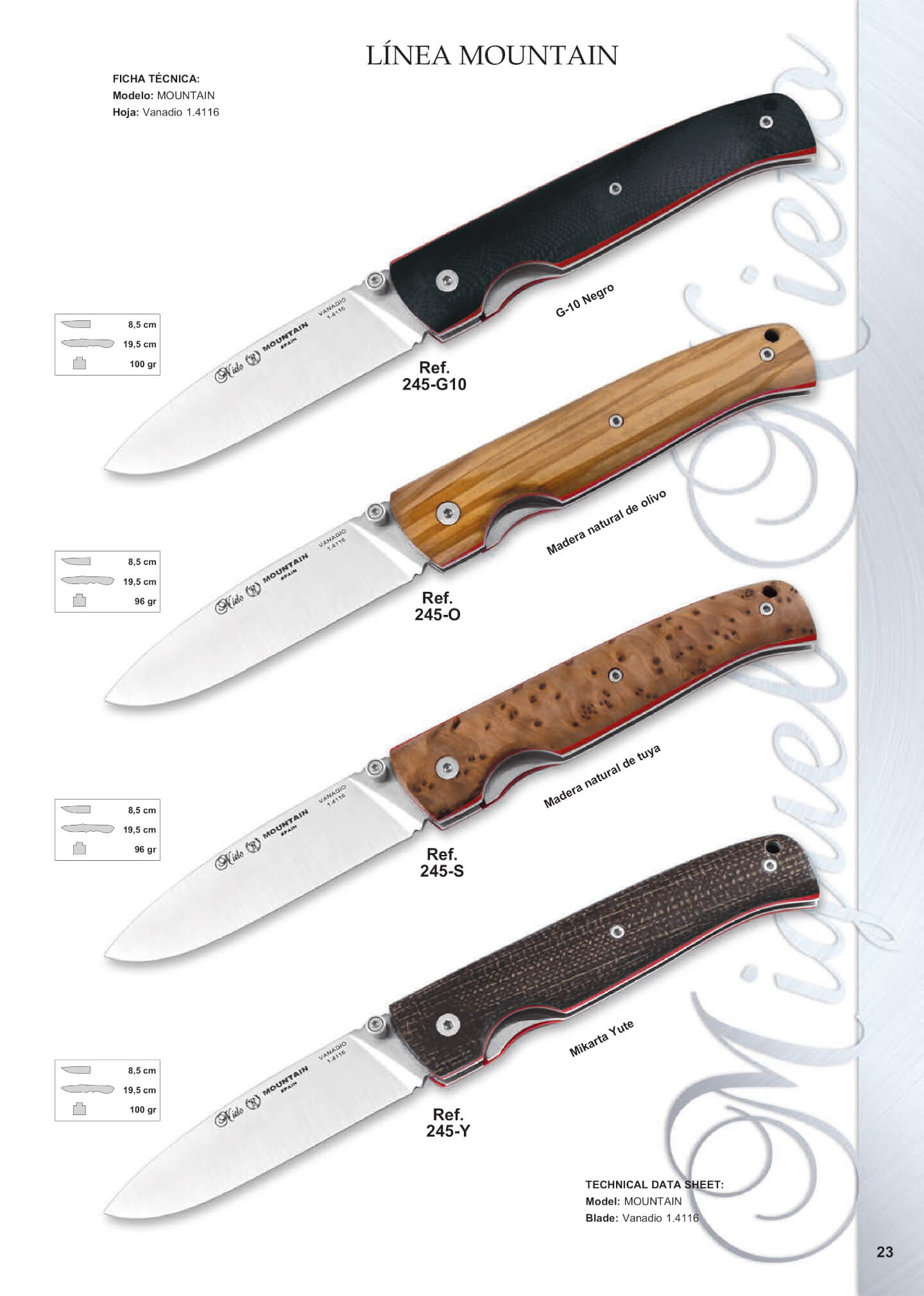 Couteaux de poche Nieto Mountain Point de chute en acier MoVa 1.4661, avec pivot pour une ouverture facile d'une seule main. Système de verrouillage doublure. Longueur de la feuille: 8,5 cm. Longueur totale: 19,5 cm. Épaisseur de la lame: 3,5 mm.