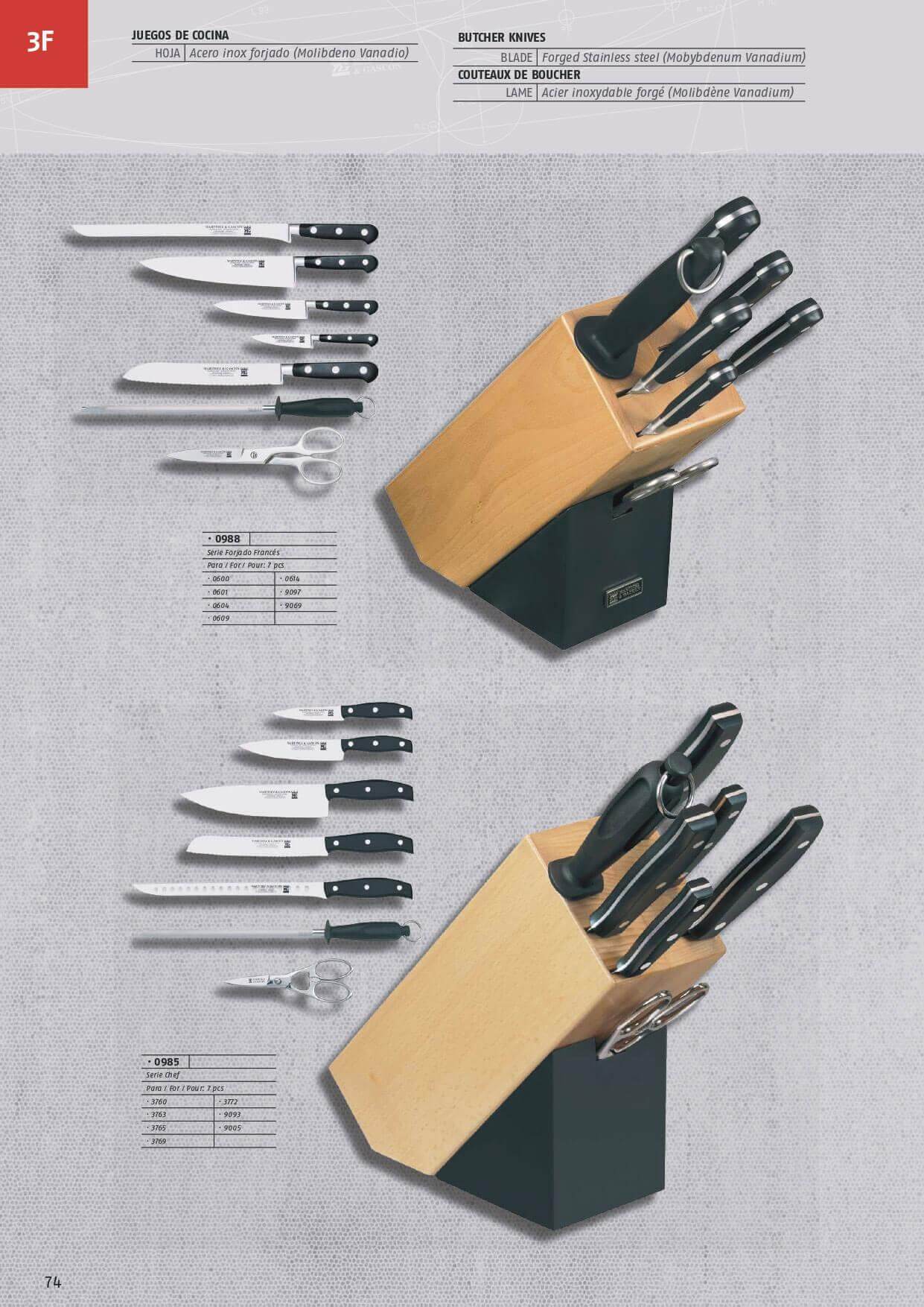 Comprend 7 pièces: ciseaux, chaira, couteau à jambon (28,5 cm), cuisiniers de 15 et 20 cm, couteau à pain et dentelle.