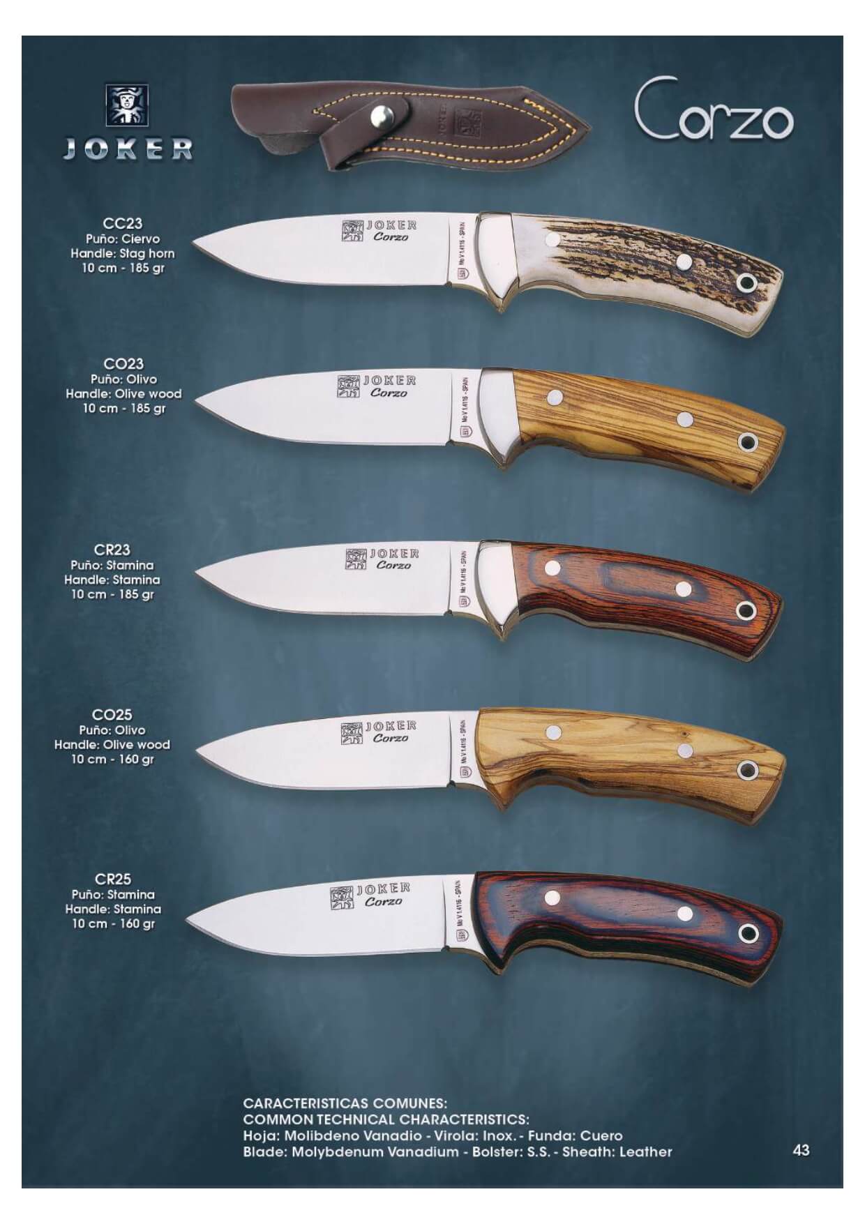 Manici in corno di cervo, legno d'ulivo e stamina. Con foro per cordino e fodero in pelle marrone.