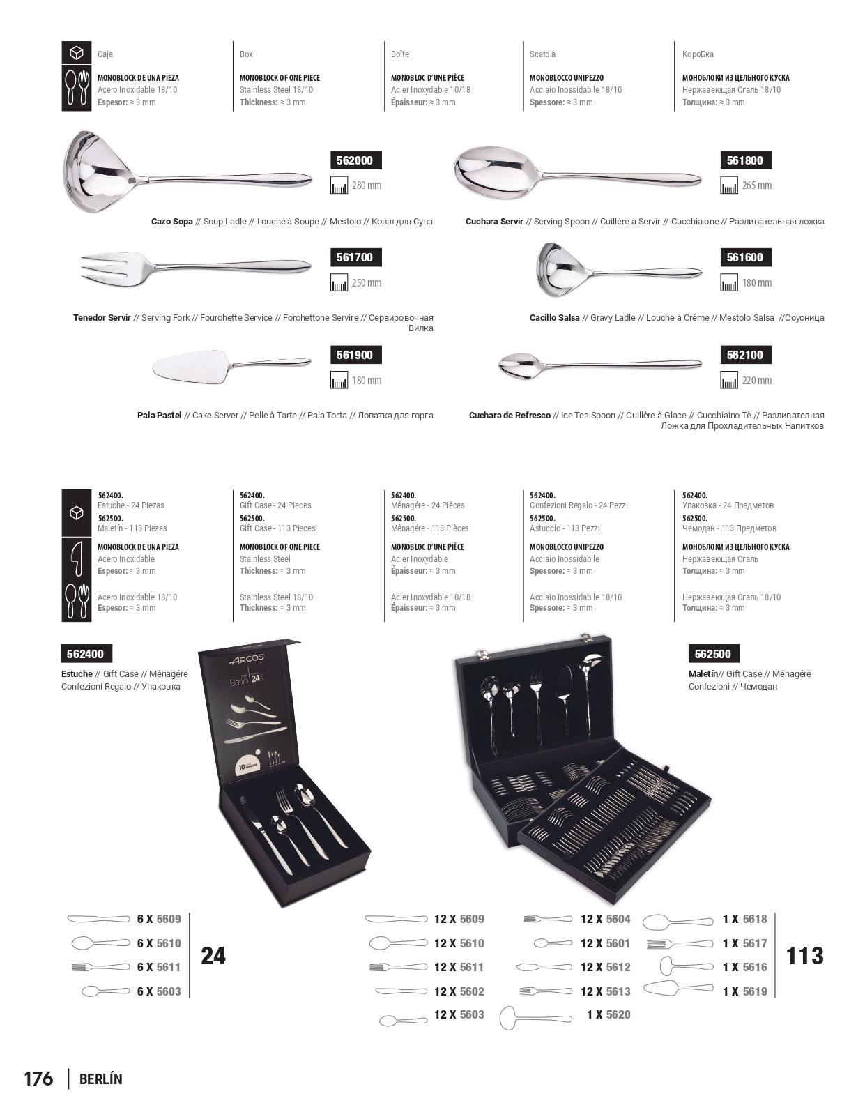 Posate di 113 pezzi. Monoblocco in un pezzo solo. Manico e lama in acciaio inox. Spessore di 3 mm. Presentato in una valigetta