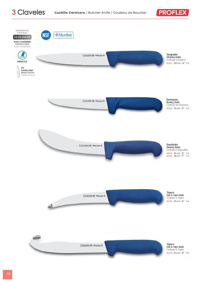 Coltelli da macellaio professionista. Lama in acciaio inox. Proflex manico. Sanguinamento, Skinner, tripero, Riprese.