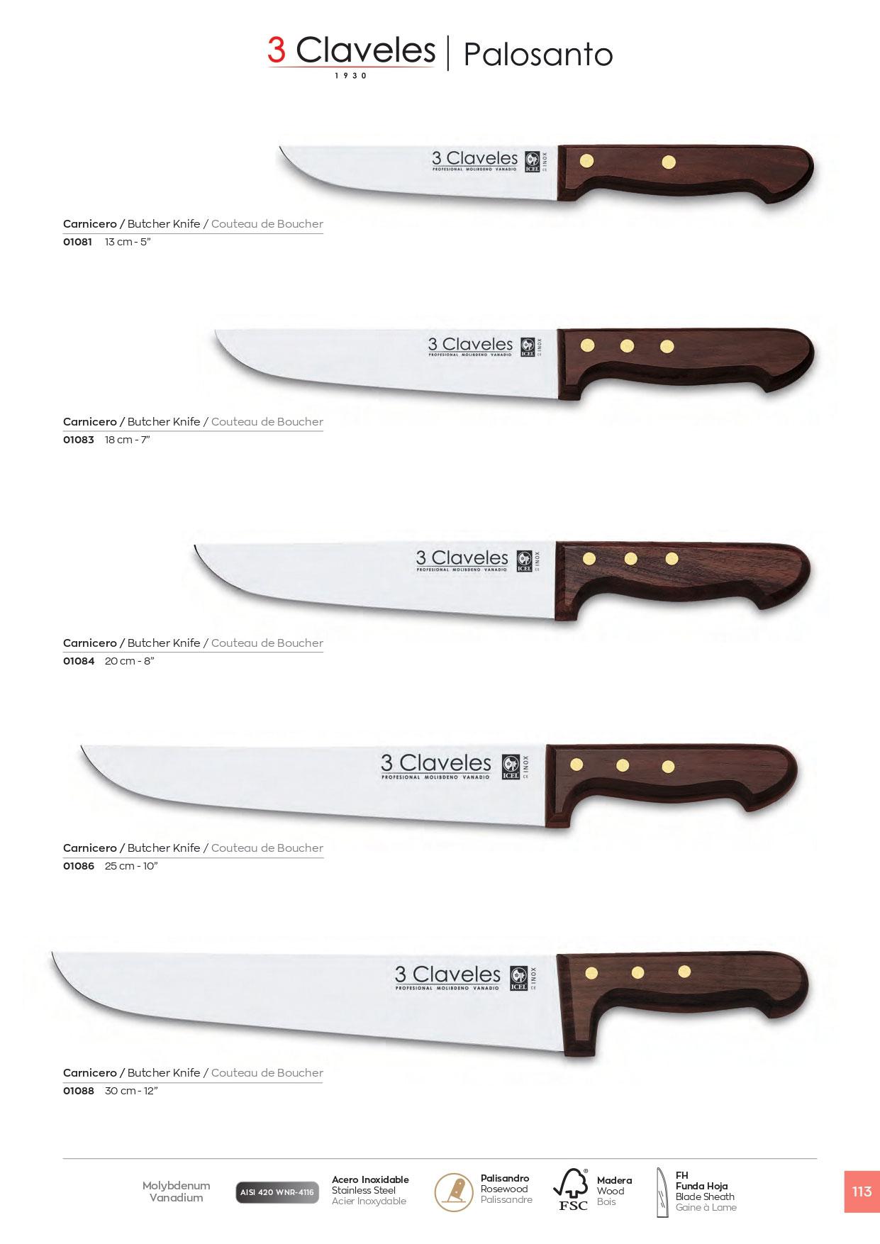 Coltelli da macellaio professionista. Lama in acciaio inox. Polipropilene manico, palissandro o POM.