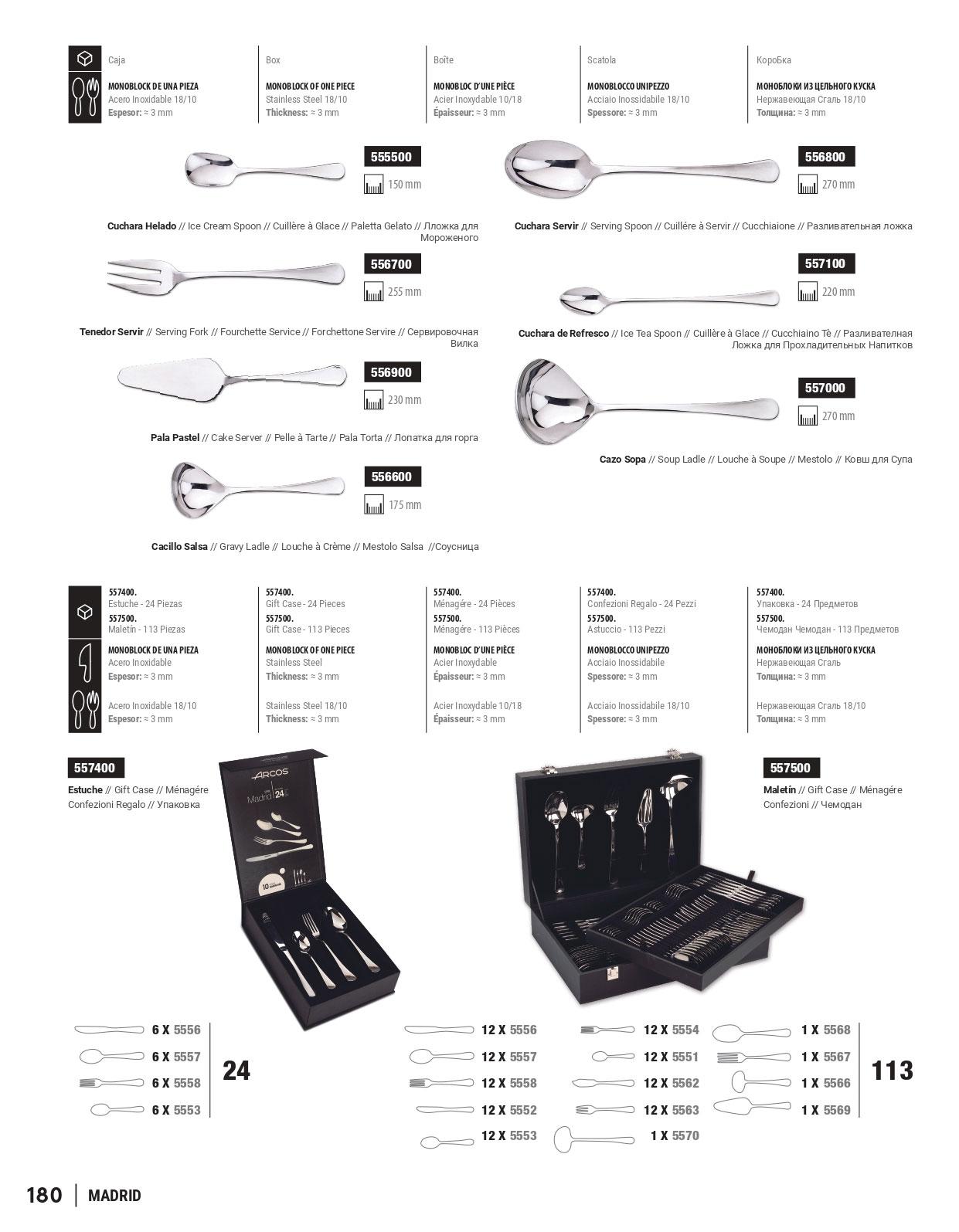 Posate, 113 pezzi. In acciaio inox. Monoblocco in un pezzo solo. Presentato in una valigetta. Madrid modello.