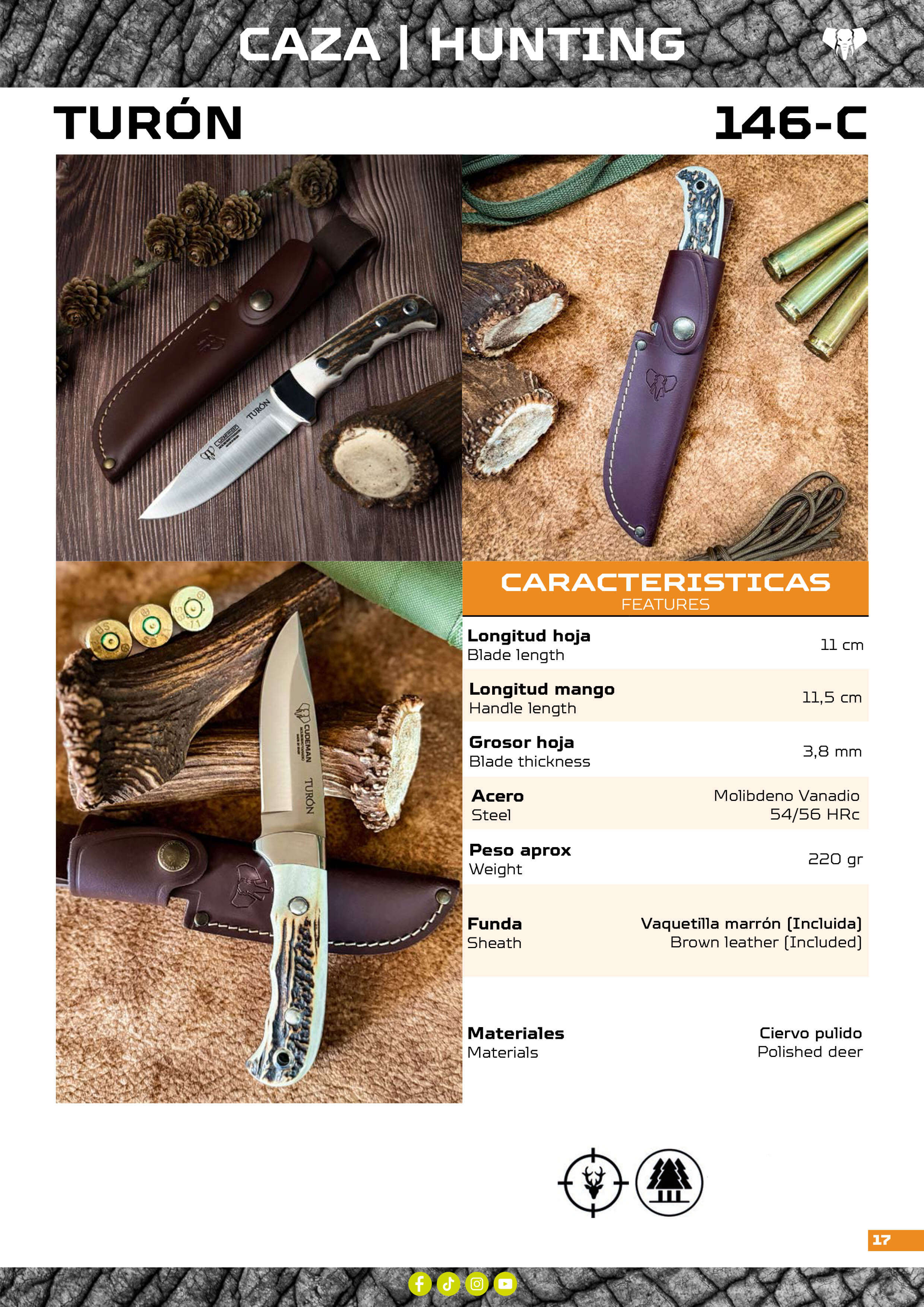 146 Coltello pieno con lama in acciaio al molibdeno Vanadio e puntale in acciaio inossidabile A-304. Lunghezza lama: 11 cm. Lunghezza totale: 22,5 cm. Spessore lama: 3.8 mm Larghezza pala: 3 cm. Custodia in pelle marrone