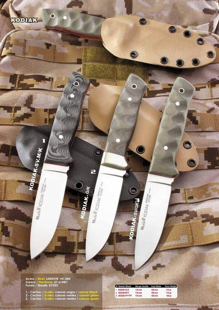Coltelli Kodiak, in acciaio Sandvik 14C28N e gestire diversi tela colorata. Fodero Kydex.