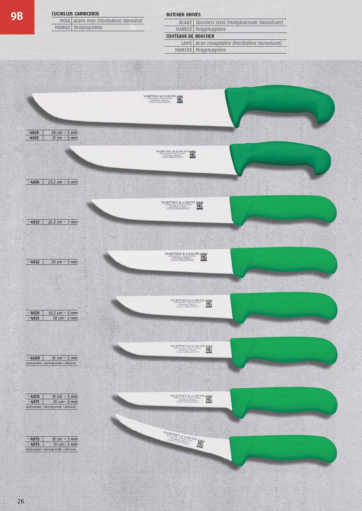 Coltelli da macellaio con lama in acciaio inox e manico in polipropilene.