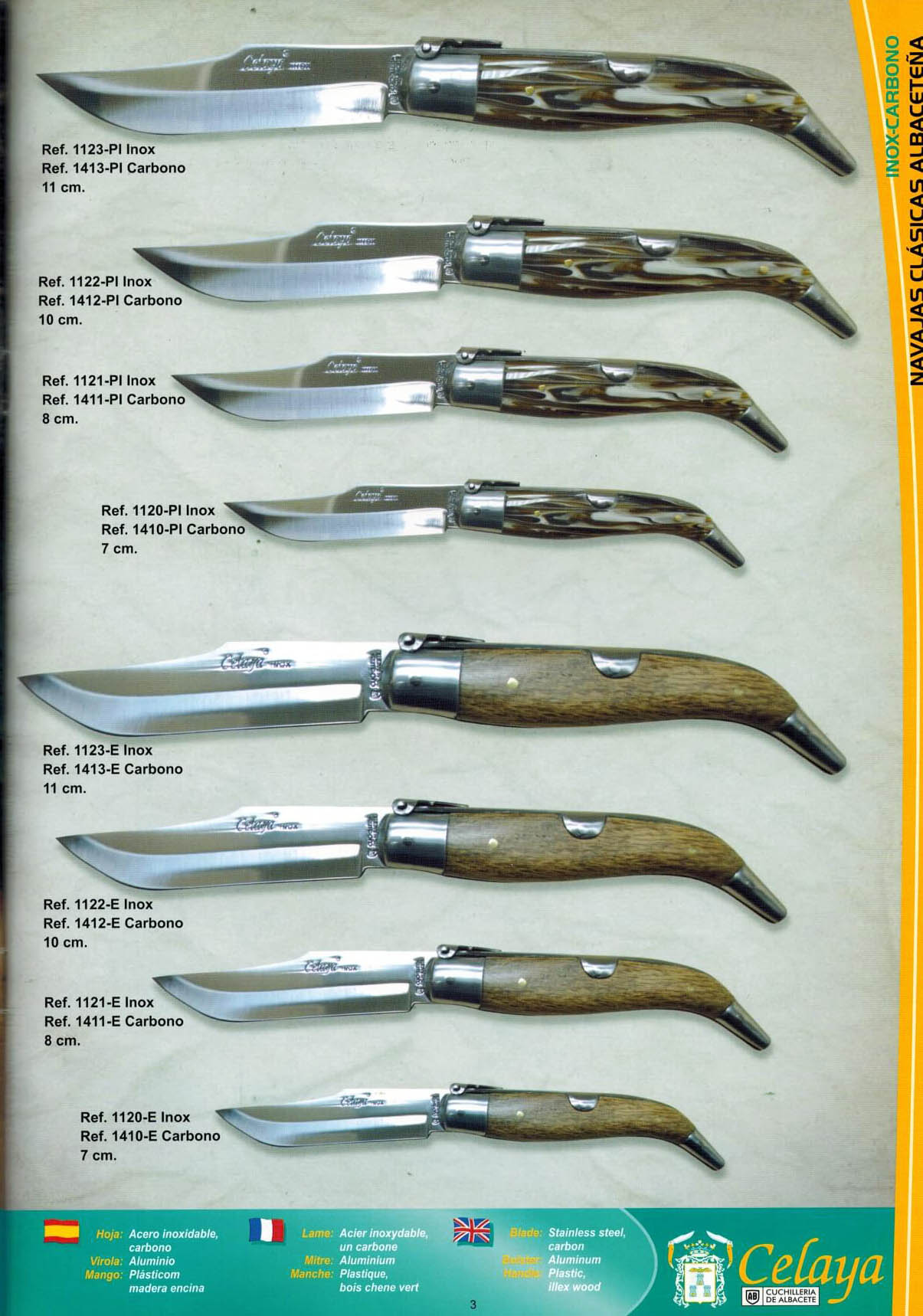 Con lame in acciaio inossidabile o in acciaio al carbonio di diverse dimensioni. I manici sono realizzati in legno di quercia naturale o in plastica che imita il corno di toro. Con ghiera in alluminio e leva di bloccaggio.